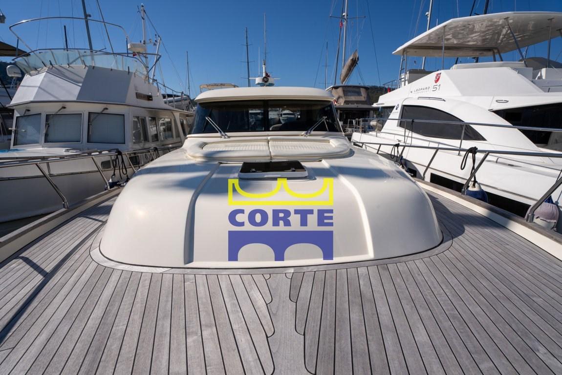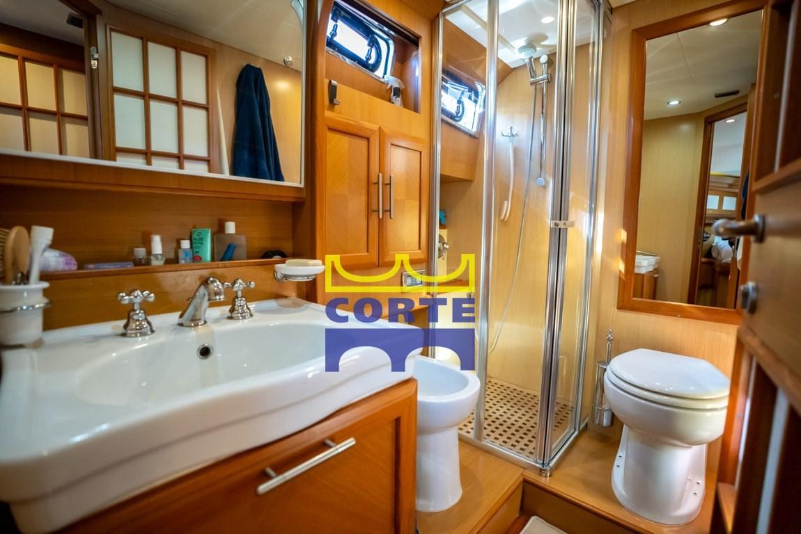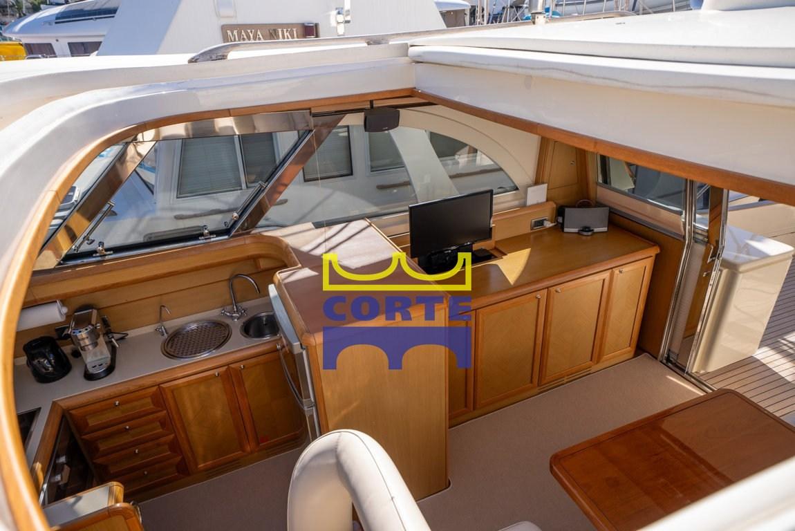 Alarme gaz, Alarme moteur, Alarme de pompe de cale, Eau sous pression, Passavant en teck, Douche de cockpit, Phare de poursuite, Flaps hydrauliques, Garage à annexe, Hard top (a movimentazione elettrica), Extincteur(s) fixe(s), Indicateurs de flaps, Lavabo dans le cockpit, Passerelle (elettroidraulica a scomparsa), Plateforme arrière (idraulica di poppa ribaltabile), Pompe de cale automatique, Porte latérale, Cockpit en teck, Prise de quai, Connexion eau sous pression à quai, Guindeau électrique, Echelle de bain, table de cockpit, Annexe (Rib con motore elettrico), Corne, Winch électrique arrière, Winch électrique avant.