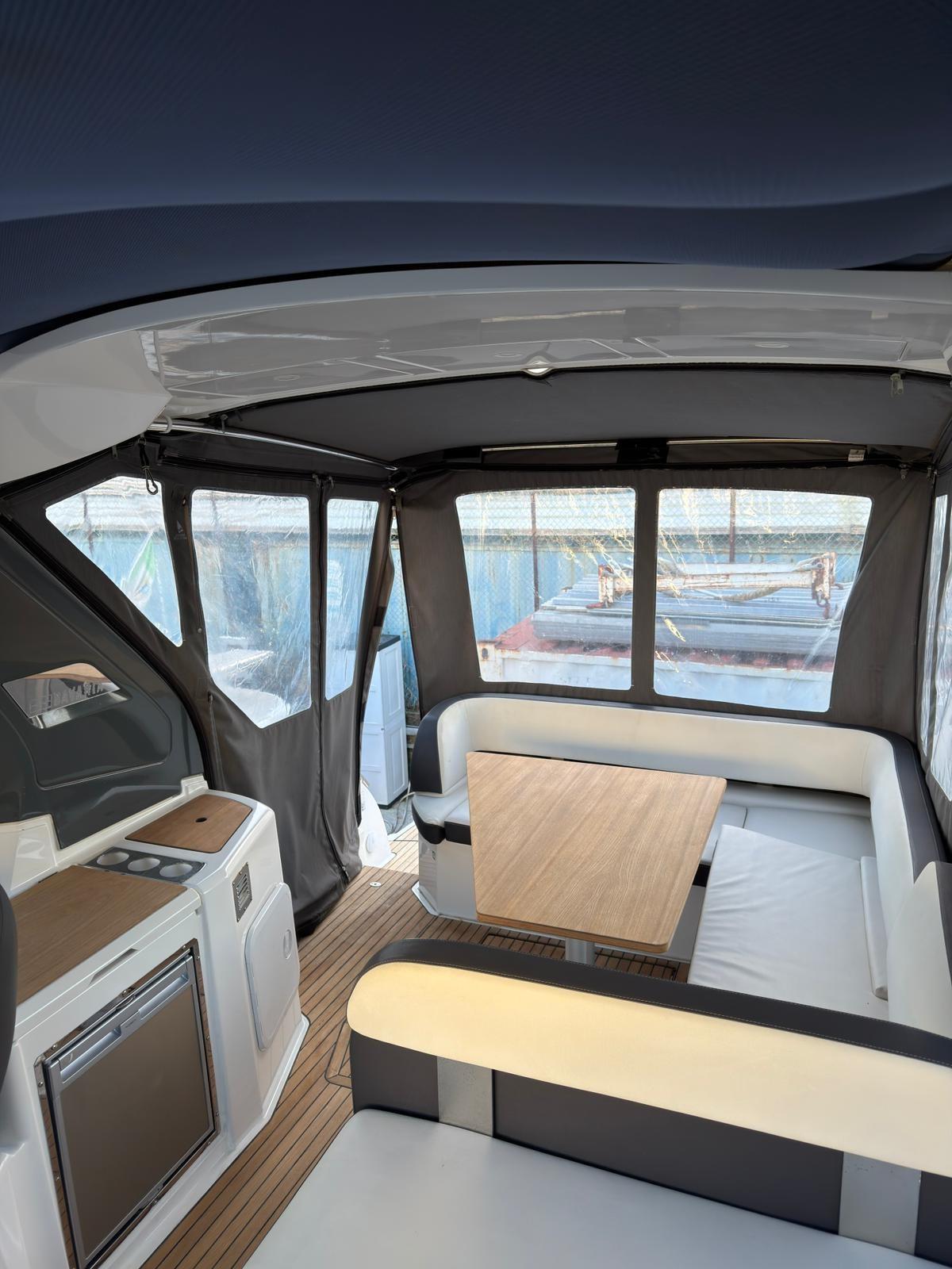 Alarme moteur, Flaps électriques, Hard top, Lavabo dans le cockpit, Défenses, Porte latérale, Cockpit en teck, Guindeau électrique, Echelle de bain, Corne.