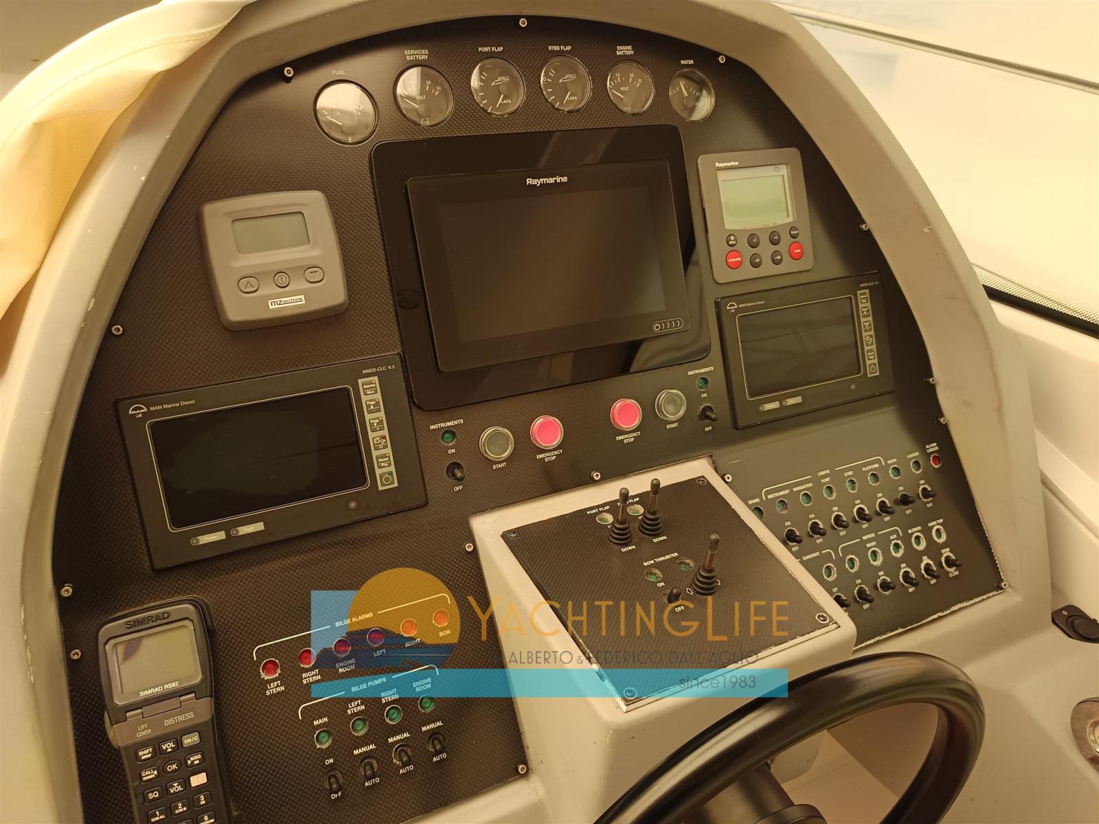 Alarme moteur, 2 Eau sous pression, Batteries (2024), Couleur spéciale (Fascia grigia 2024), Douche de cockpit, Flaps hydrauliques, Hard top, Extincteur(s) fixe(s), Indicateurs de flaps, Lavabo dans le cockpit, Éclairage de courtoisie, Spots sous-marins (Oceanled), Passerelle (Idraulica), Plateforme arrière (Teak 2024), Pompe de cale automatique, Porte latérale, Cockpit en teck, Prise de quai, Guindeau électrique, table de cockpit, Corne, Winch électrique arrière.