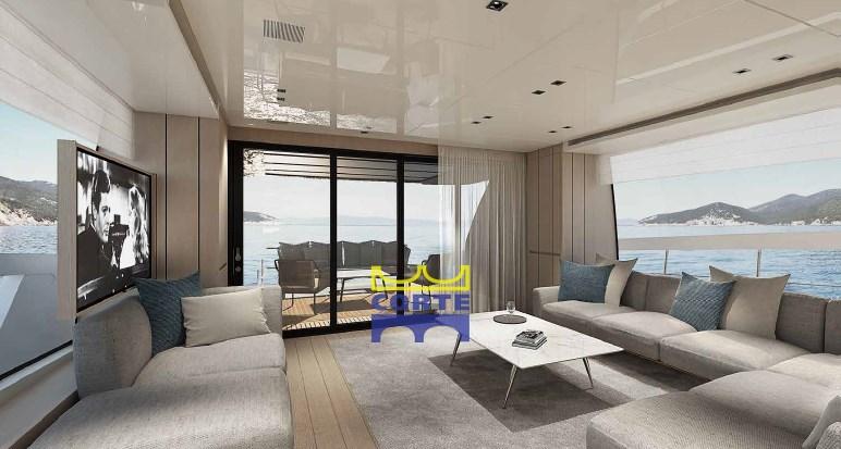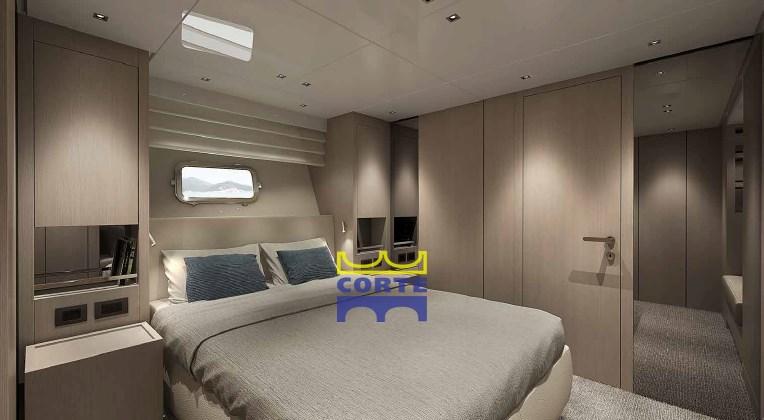 Pack de navigation diamant Raymarine, prises étanches, wi-Fi 4G, télévision en circuit fermé. sol en teck, système Wi Fi, fenêtres latérales volantes pouvant être ouvertes électriquement, climatisation à vol, plate-forme centrale de plage avec mouvement électrique, filtre à charbon actif pour l’eau douce, table à manger avec hauts et bas manuels, table volante avec hauts et bas électriques, 2ème générateur de 28 kW, plaque de cuisson sur le flybridge, modification de la zone de l’équipage avec appareils en mouvement, parquet du couloir du pont inférieur, Rideaux de salon électriques et cabines principales, armoire supplémentaire sur le flybridge.