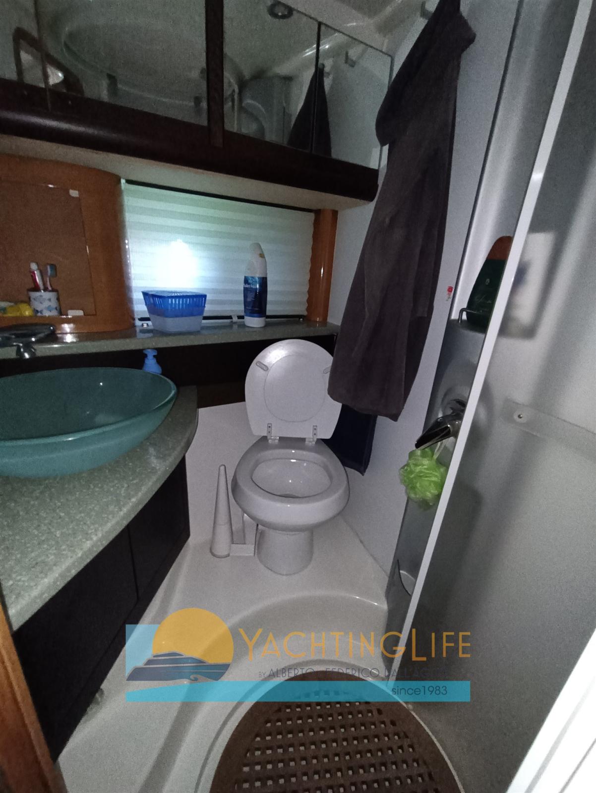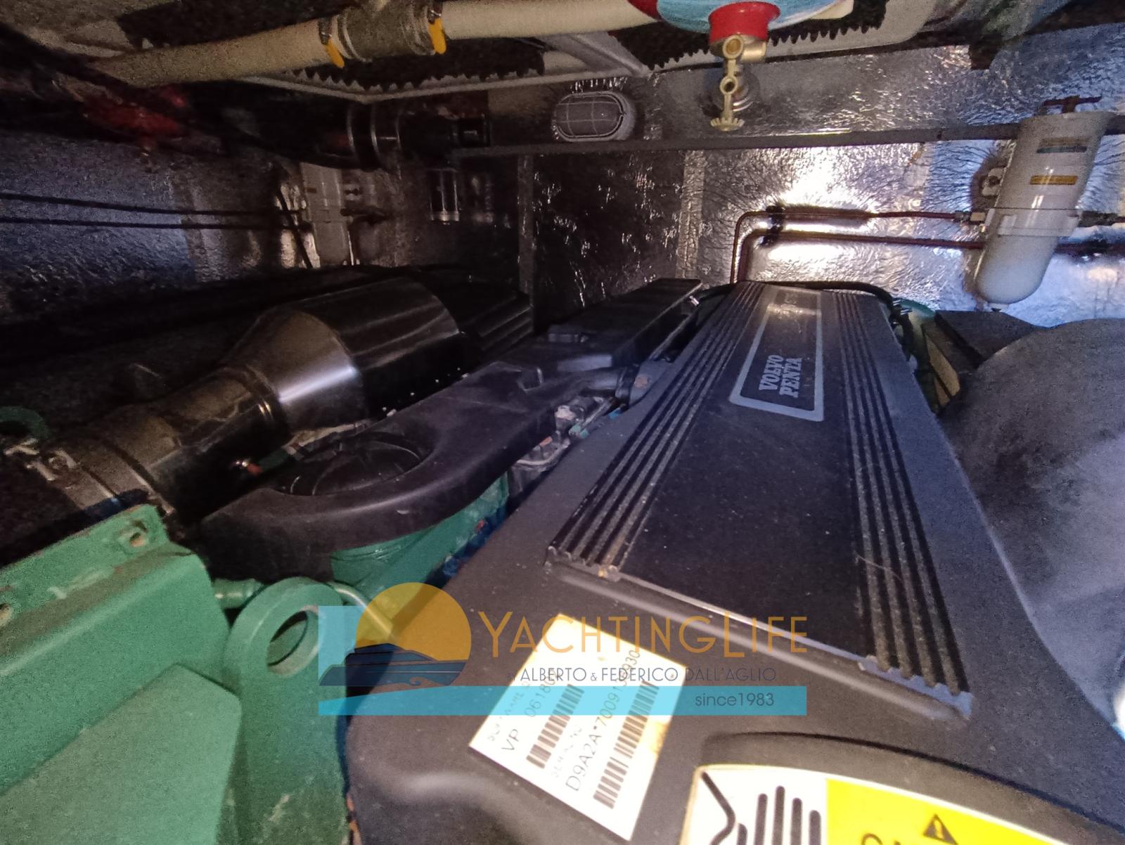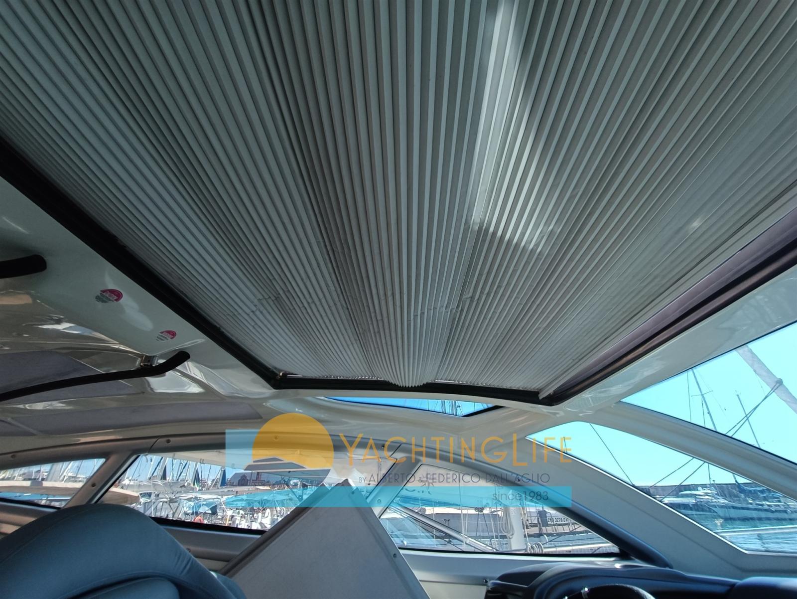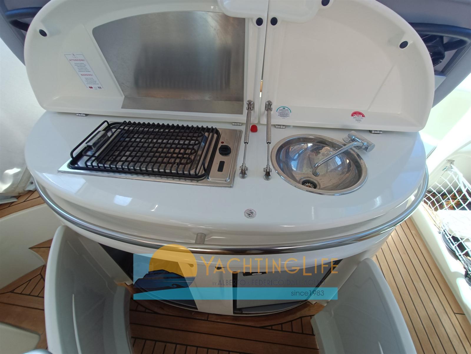 Alarme moteur, Alarme de pompe de cale, Eau sous pression, Douche de cockpit, Phare de poursuite, Flaps électriques, Garage à annexe, Hard top, Indicateurs de flaps, Lavabo dans le cockpit, Éclairage de courtoisie, Passerelle (idraulica), Pompe de cale automatique, Cockpit en teck, Prise de quai, Guindeau électrique, Echelle de bain, table de cockpit, Annexe (Moto d'acqua nel garage), Corne, Winch électrique arrière.