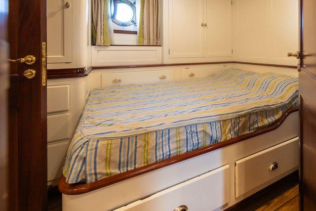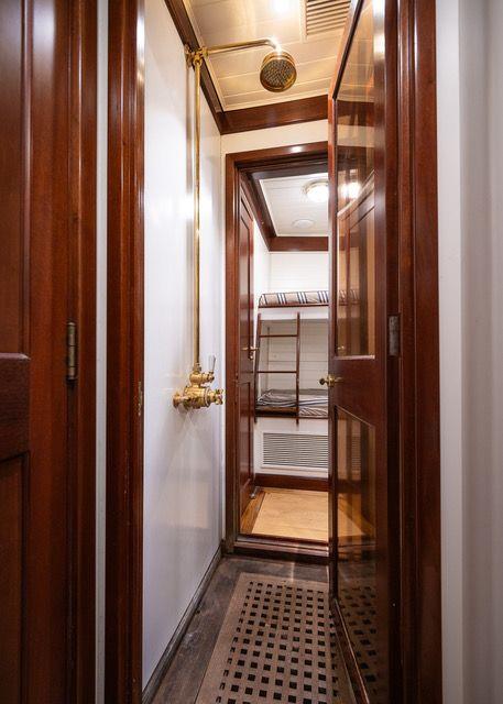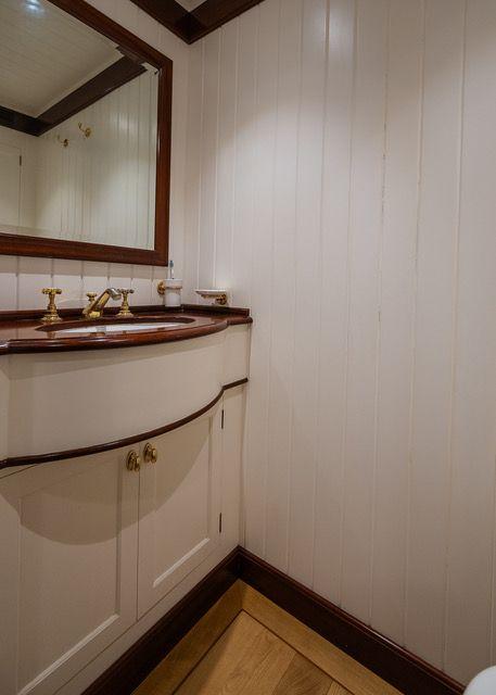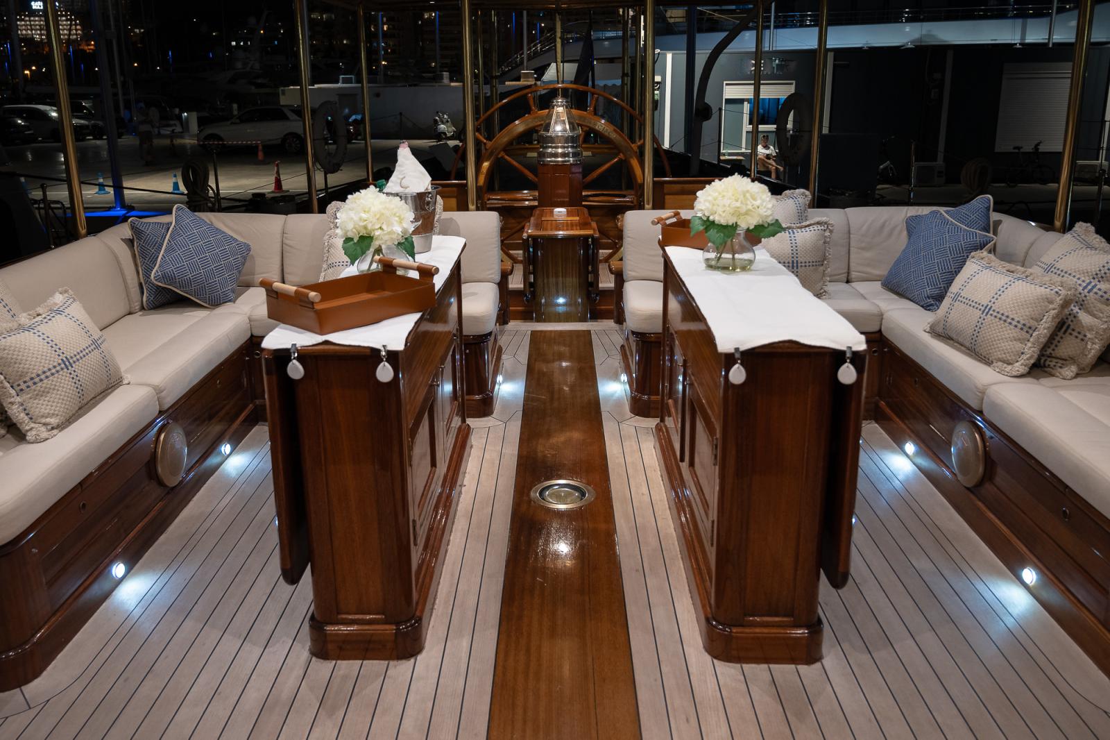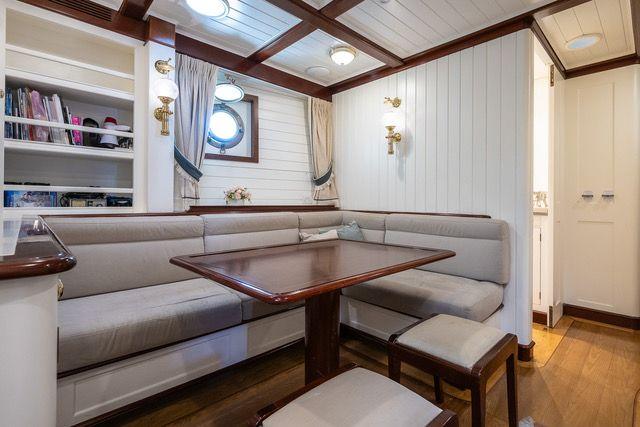L'intérieur du navire est un hommage à la tradition. Bois d'acajou et de châtaignier, salons élégants, sept cabines pouvant accueillir jusqu'à quatorze personnes, un bureau et une buanderie créent une atmosphère qui vous transporte au siècle dernier.