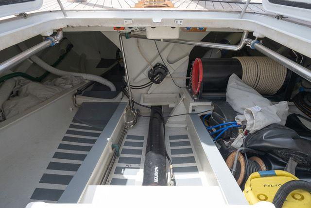 Inventaire de voiles : une grand-voile à battement complet, une goélette à battement complet, un foc tempête, un gennaker et deux génois sur enrouleur.