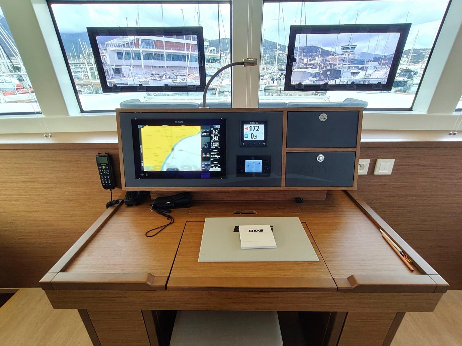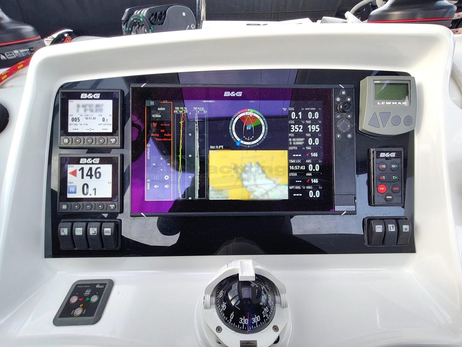 AIS (B&G), Indicateur d'angle de barre, Antenne radar, Compas (Plastimo), Ordinateur fixe de bord, Compteur de chaîne, Loch (B&G), 3 Moniteur (Triton B&G), Sondeur pêche (B&G), Loch (B&G), Pilote automatique (B&G), Plotter GPS (B&G Zeus), Radar (B&G Zeus), Radio VHF (B&G), Anémomètre/Girouette (B&G).