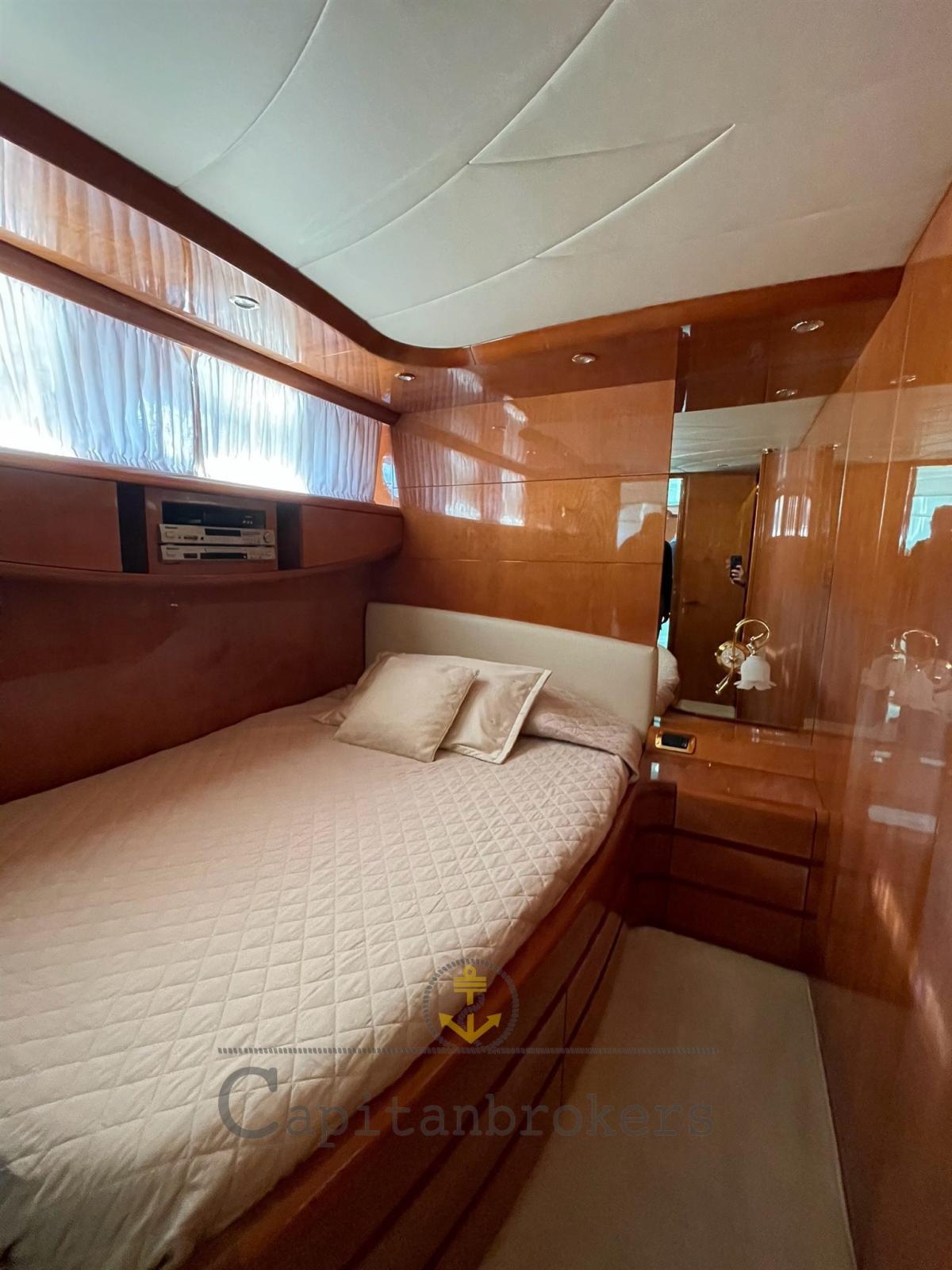 Mobilier intérieur en bois de cerisier laqué brillant en bon état général, parquet avec moquette légère. Salon double avec canapés en cuir, 4 toilettes avec douche et bidet.