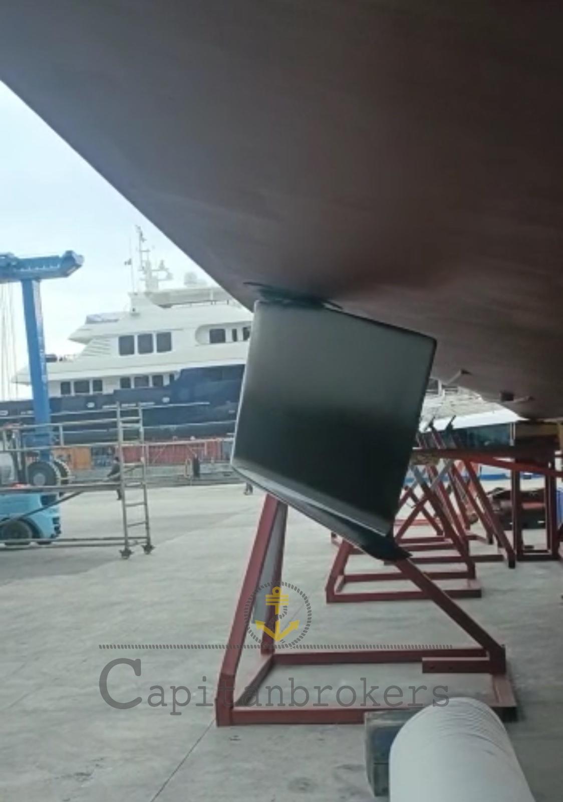 Dérives stabilisatrices CMC, propulseur arrière, propulseur d’étrave, troisième poste de pilotage, instrumentation récente Raymarine Axiom, machine à eau, garage de tender, bossoirs de tender.