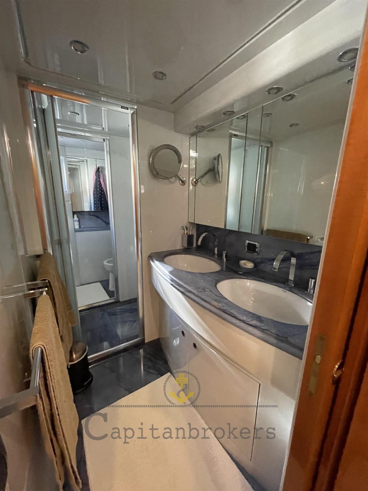 Cabine du propriétaire au centre du navire avec une grande salle de bain et une cabine de douche.