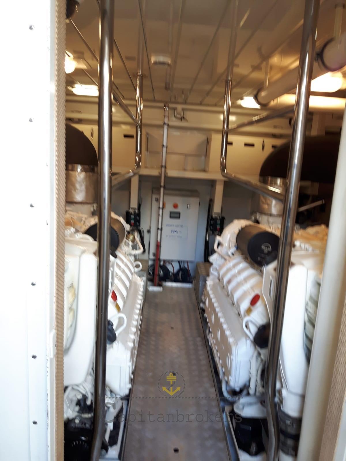 Alarme moteur, Alarme de pompe de cale, Eau sous pression, Douche de cockpit, Double barre à roue, Phare de poursuite, Flaps électriques, Bossoirs, Grue de flybridge, Extincteur(s) fixe(s), Passerelle, Plateforme arrière, Pompe de cale automatique, Porte latérale, Cockpit en teck, Prise de quai, Connexion eau sous pression à quai, Guindeau électrique, Echelle de bain, Stabilisateurs (Pinne stabilizzatrici), table de cockpit, Annexe, Winch électrique arrière, Winch électrique avant.
