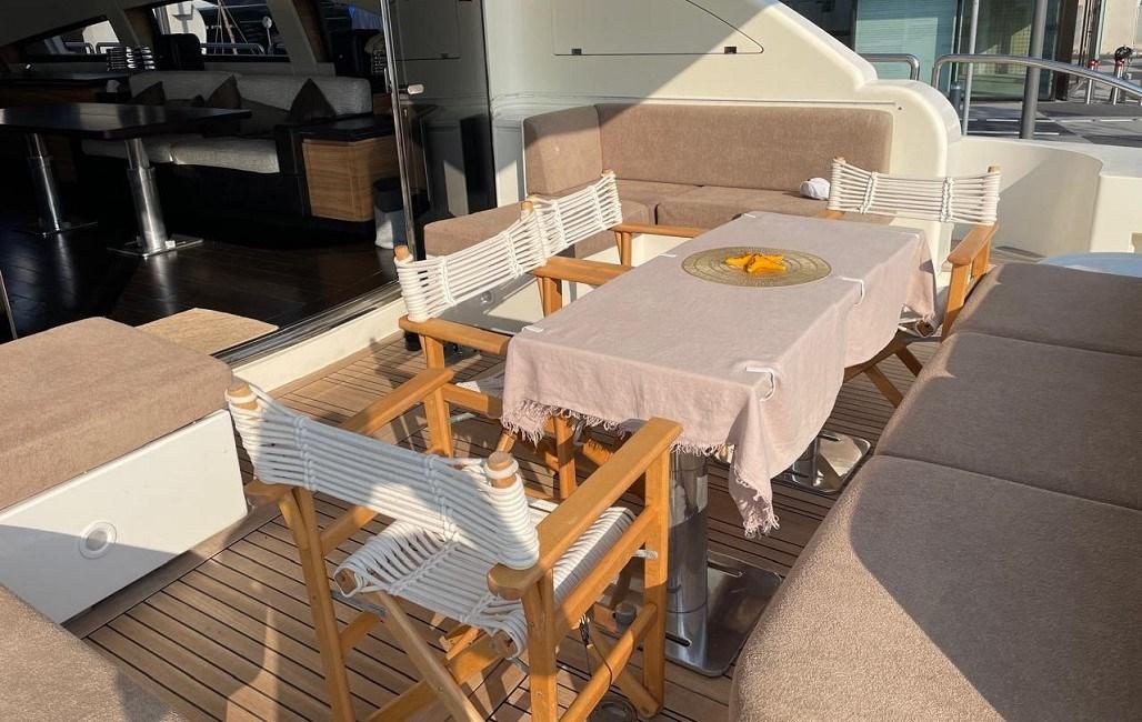 Devant l’entrée du salon principal, il y a des canapés d’angle des deux côtés avec deux tables et un canapé qui rejoint une grande terrasse le long de la poupe. Un escalier de chaque côté mène à la plate-forme de bain sur le pont inférieur. Des passerelles latérales mènent le long du pont principal jusqu’au pont avant, où se trouve un autre canapé en forme de C avec deux tables et de grandes chaises longues