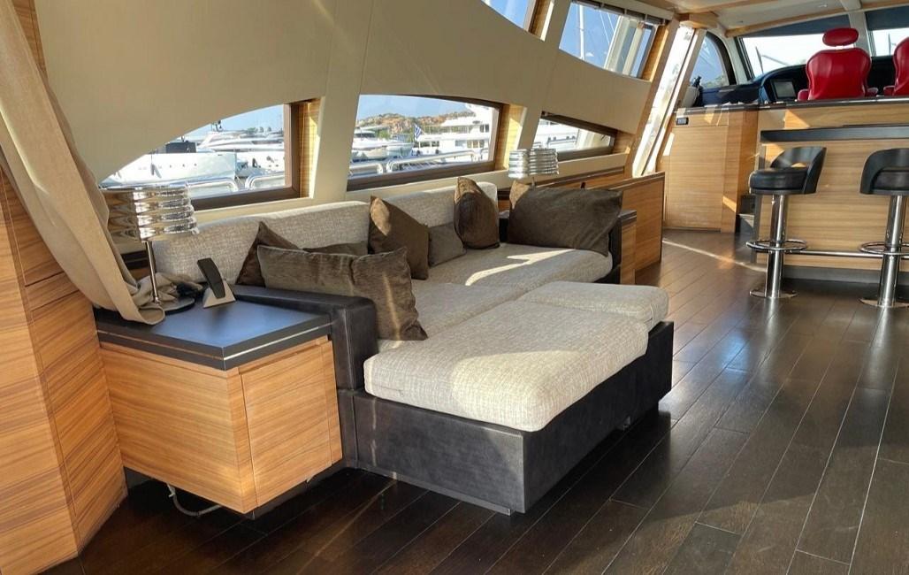 Hall d’entrée avec coin salon, avec canapé en L à gauche, canapé avec tables pliantes à tribord | Bar d’angle central derrière la timonerie avec toit panoramique | Salle home cinéma à l’avant avec TV 3D 60" qui se transforme en une 5ème cabine double avec canapé-lits et salle de bain