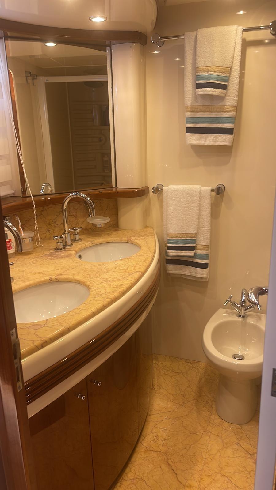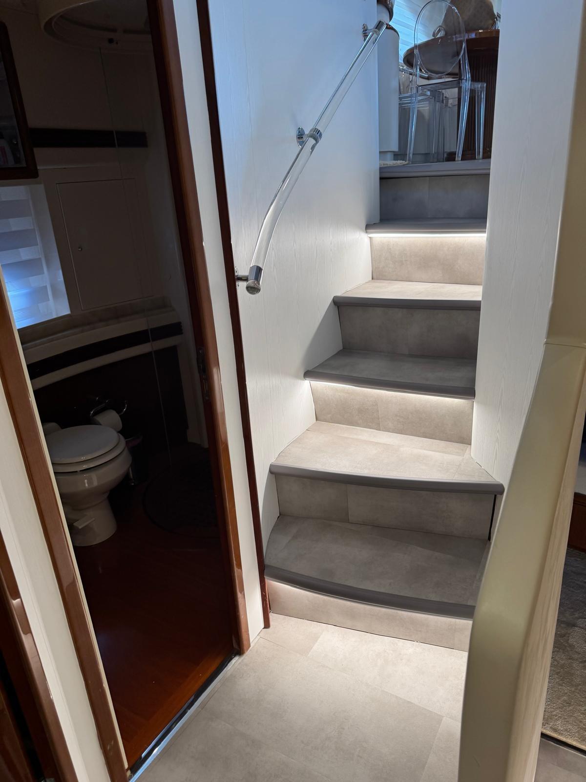 Alarme gaz, Alarme moteur, Alarme de pompe de cale, Eau sous pression, Passavant en teck, Douche de cockpit, Flaps hydrauliques, Grue de flybridge, Passerelle, Porte latérale, Cockpit en teck, Guindeau Hydraulique, Echelle de bain, table de cockpit, Winch électrique arrière, Winch électrique avant.