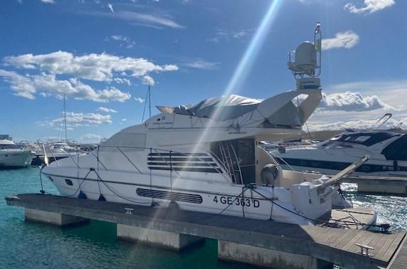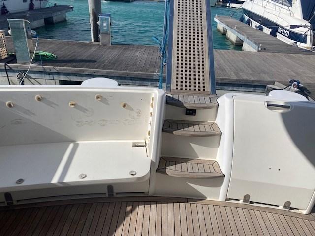 Alarme gaz, Alarme moteur, Alarme de pompe de cale, Eau sous pression, Douche de cockpit, Flaps électriques, Extincteur(s) fixe(s), Éclairage de courtoisie, Spots sous-marins, Passerelle, Plateforme arrière, Pompe de cale automatique, Pompe de cale manuelle, Cockpit en teck, Prise de quai, Onduleur, Rollbar, Guindeau électrique, Echelle de bain, Corne.