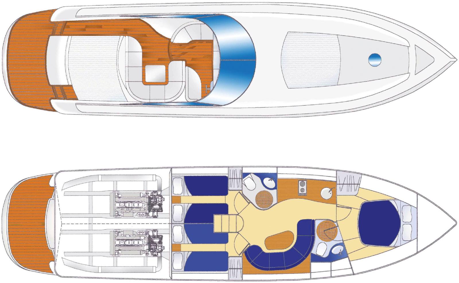 Ouverture haute performance, proposée, avec une importante remise à niveau 2023 : nouvelles hélices de surface avec des rapports optimisés (meilleures performances et consommation réduite), papillons électroniques ZF, salle des machines réaménagée, nouveau teck et rembourrage.