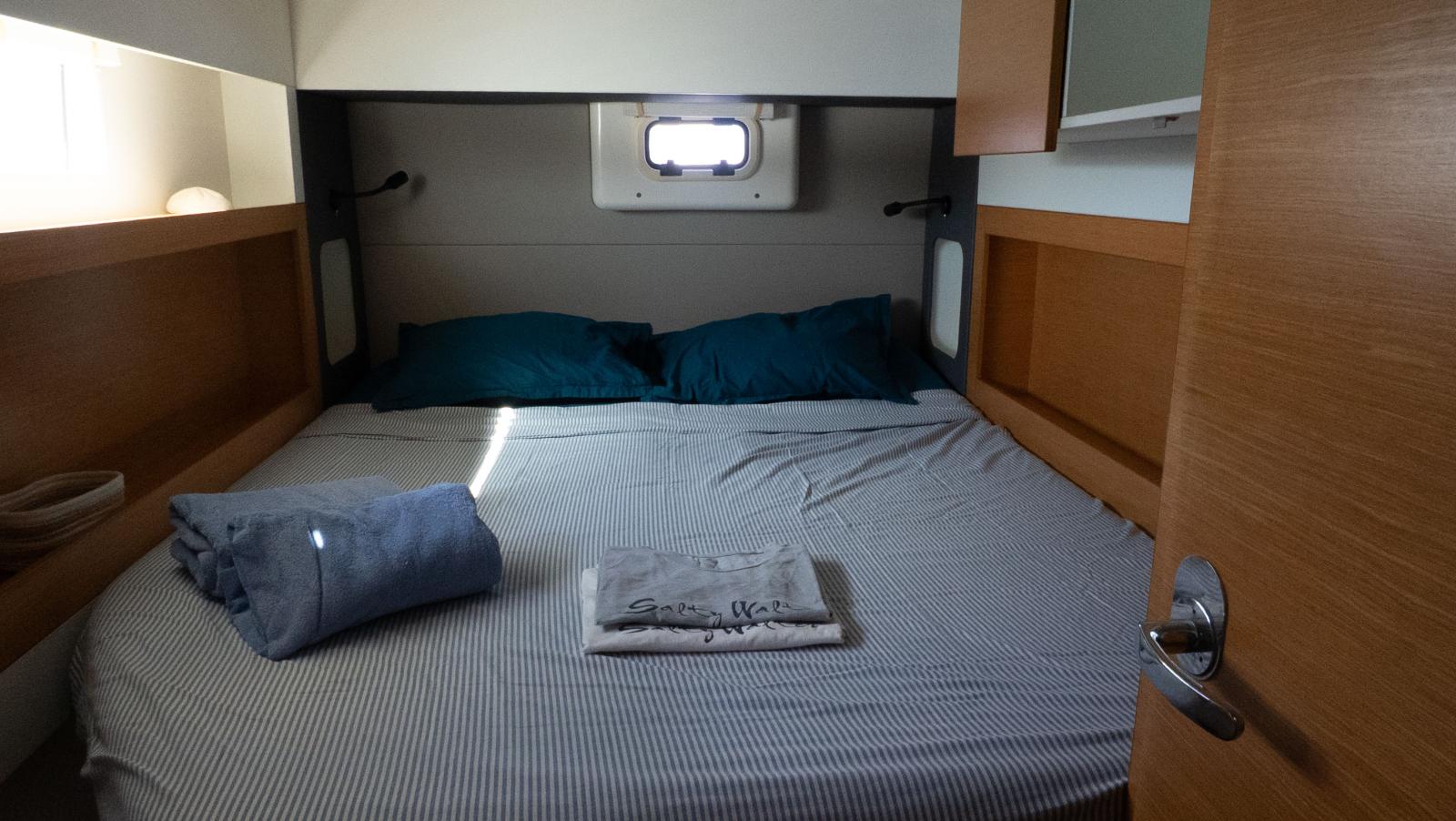 Avec ses 11,98 m de longueur, 6,91 m de largeur et un tirant d’eau de 1,35 m, ce catamaran offre un compromis idéal entre performance, stabilité et accessibilité aux mouillages peu profonds.