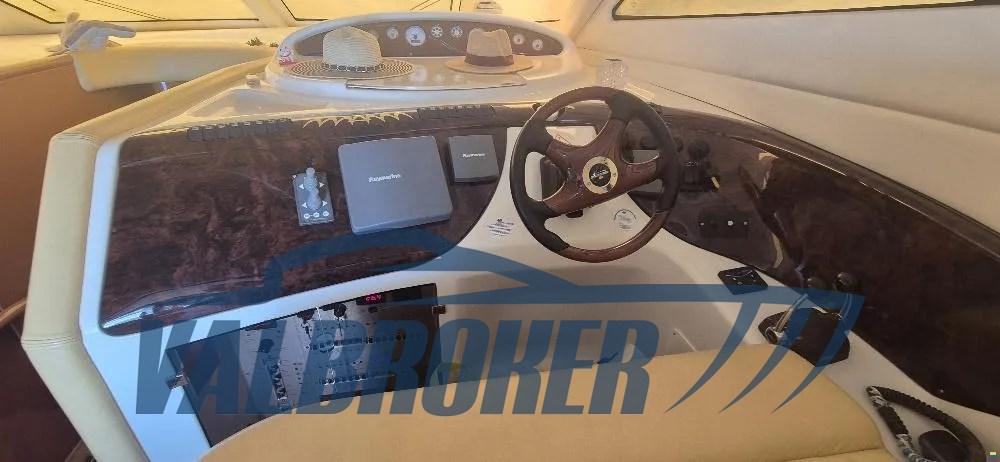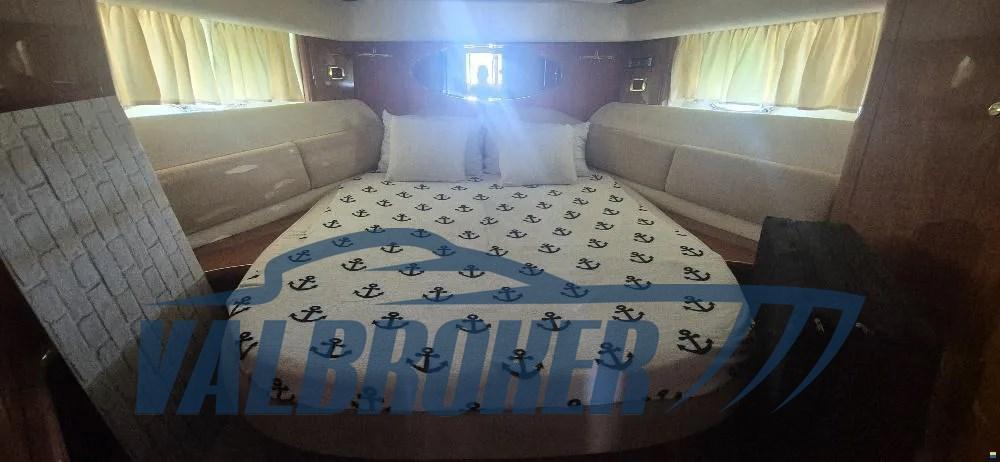 Flybridge du chantier naval italien. 2x ligne d’arbre Volvo Penta D9. Double cabine à la proue, double cabine d’invités, cabine d’invités avec lits simples et cabine de marin.
