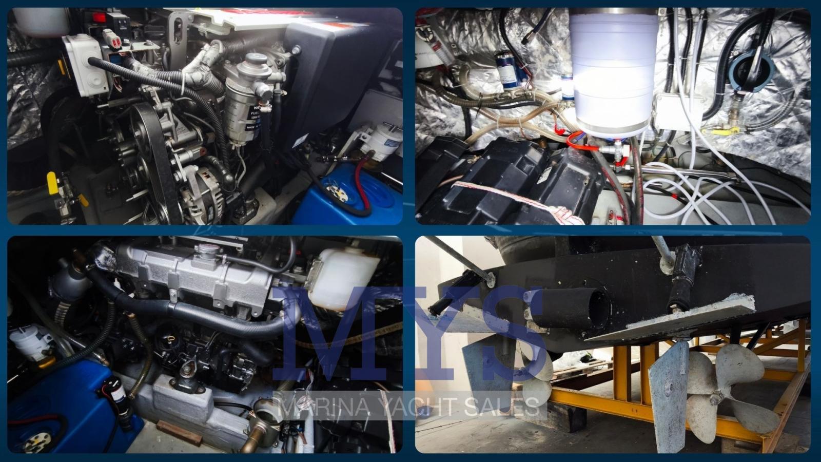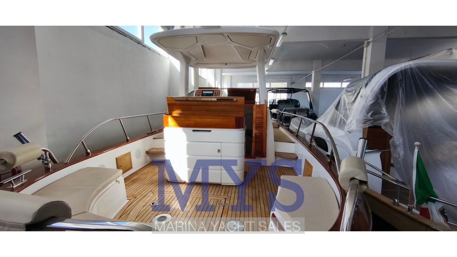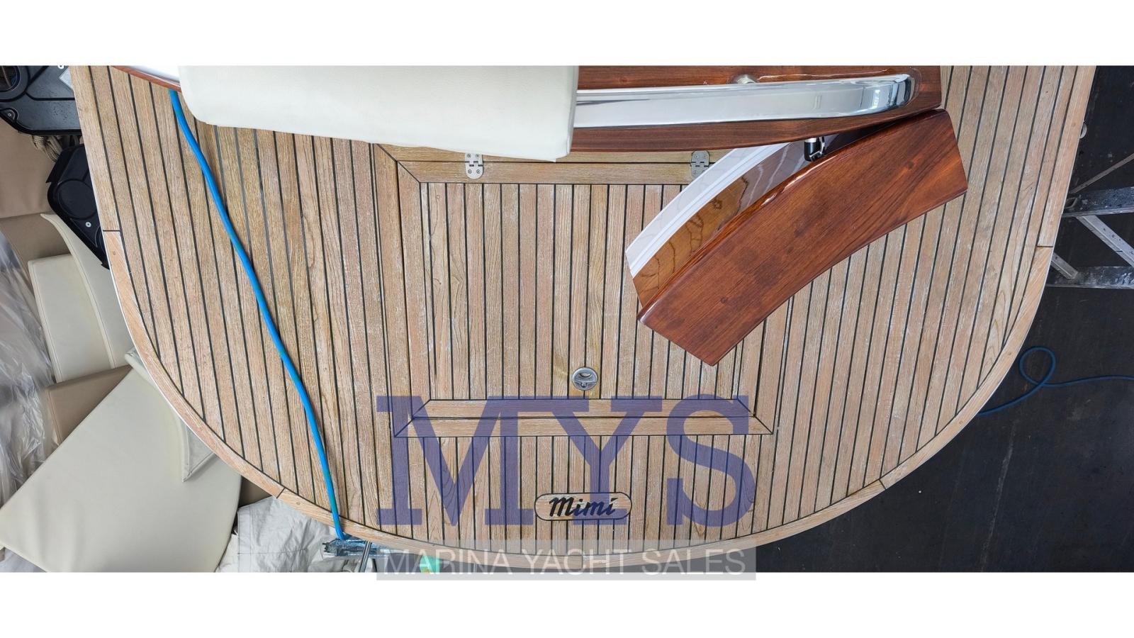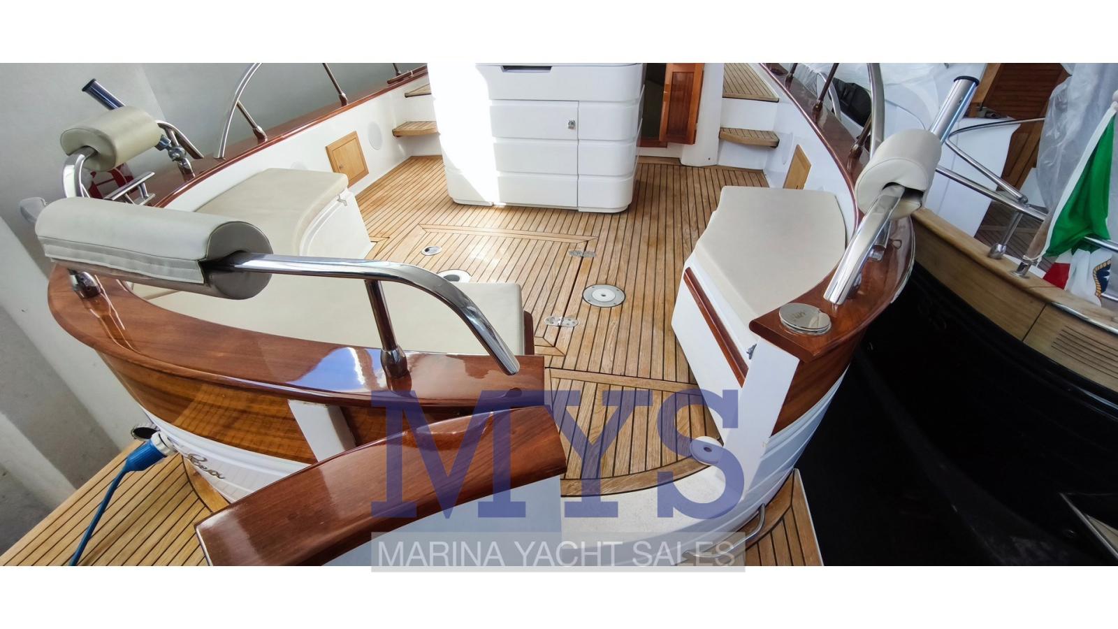 Alarme moteur, Alarme de pompe de cale, Ancre (Delta kg. 10 + mt. 50 di catena), Eau sous pression, Batteries (2 x 100 Ah), Passavant en teck, Câble d’alimentation à quai, Douche de cockpit, Phare de poursuite, Flaps hydrauliques, Hard top, Extincteur(s) fixe(s), Lavabo dans le cockpit, Éclairage de courtoisie, Moniteur de batterie, Plateforme arrière (in teak), Pompe de cale automatique, Pompe de cale manuelle, Porte latérale, Cockpit en teck, Prise de quai, Guindeau électrique, Echelle de bain, table de cockpit, Corne, Pont en teck.
