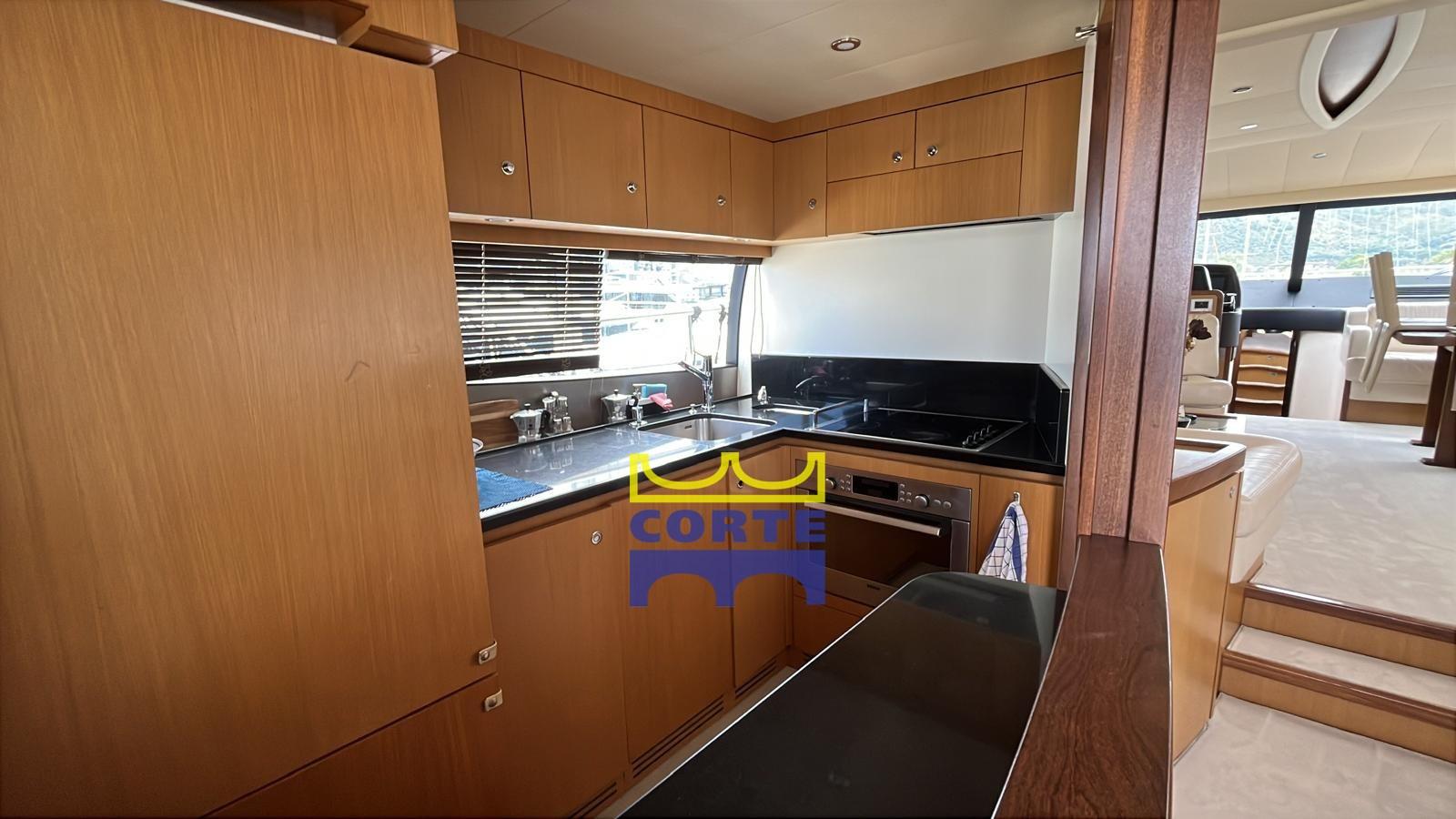 Dans le cockpit du Ferretti 630, il y a 2 tables fixes en teck qui peuvent être assemblées à une table supplémentaire et peuvent accueillir jusqu’à 8 personnes. Un meuble bar, avec la possibilité d’insérer une machine à glaçons, a été créé près de l’espace dédié à la cuisine, qui dialogue avec l’extérieur grâce à une porte surmontée. Depuis le cockpit, il est possible d’accéder à la zone de l’équipage où se trouve une cabine avec deux lits et une salle de bain privée.