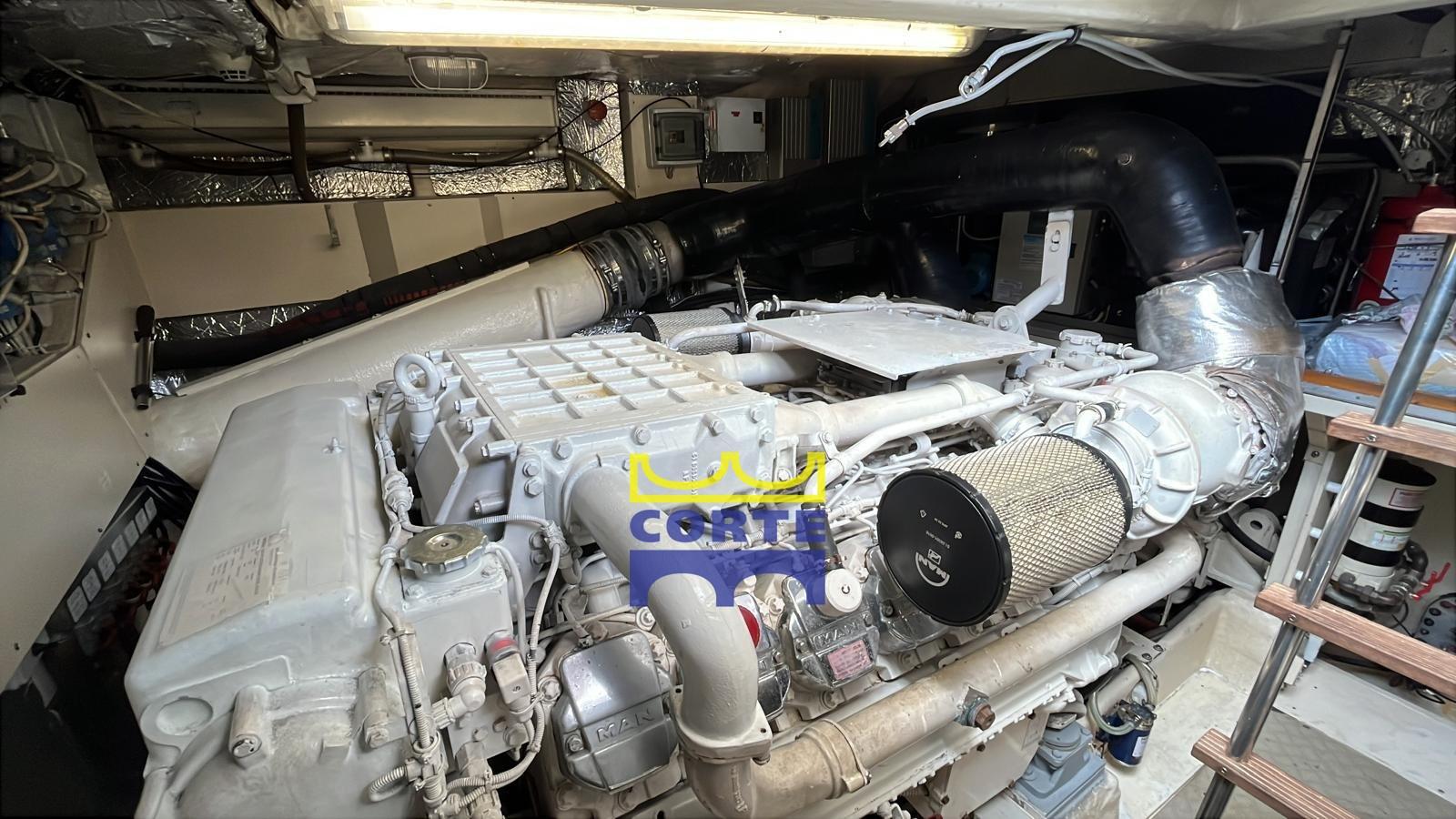 Alarme gaz, Alarme moteur, Alarme de pompe de cale, Eau sous pression, Câble d’alimentation à quai, Douche de cockpit, Double barre à roue, Phare de poursuite, Flaps hydrauliques, Bossoirs pour annexe (passerella), Extincteur(s) fixe(s), Indicateurs de flaps, Lavage de chaine, Lavabo dans le cockpit, Éclairage de courtoisie, Moniteur de batterie, Passerelle (elettroidraulica), Plateforme arrière (poppa in teak con gavone ad apertura elettrica), Pompe de Vidange du Réservoir d’Eaux Usées, Pompe de cale automatique, Pompe de cale manuelle, Pont en teck, Porte latérale, Porte latérale, Cockpit en teck, Prise de quai, Connexion eau sous pression à quai, Répétiteur électronique, Rollbar, Guindeau électrique, Echelle de bain, table de cockpit, Corne, 2 Winch électrique arrière, Winch électrique avant.
