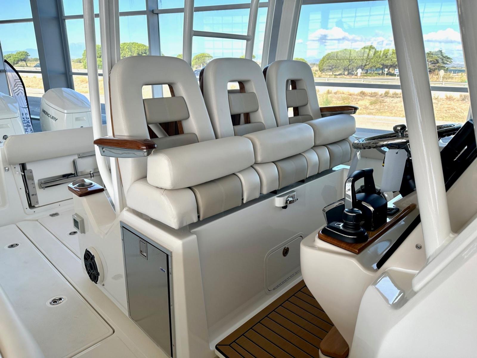 Confort et praticité : réfrigérateurs bâbord et tribord, table avant en teck, strapontins pliants, prises 12 V tableau arrière, racks supplémentaires pour cannes à pêche en cabine.