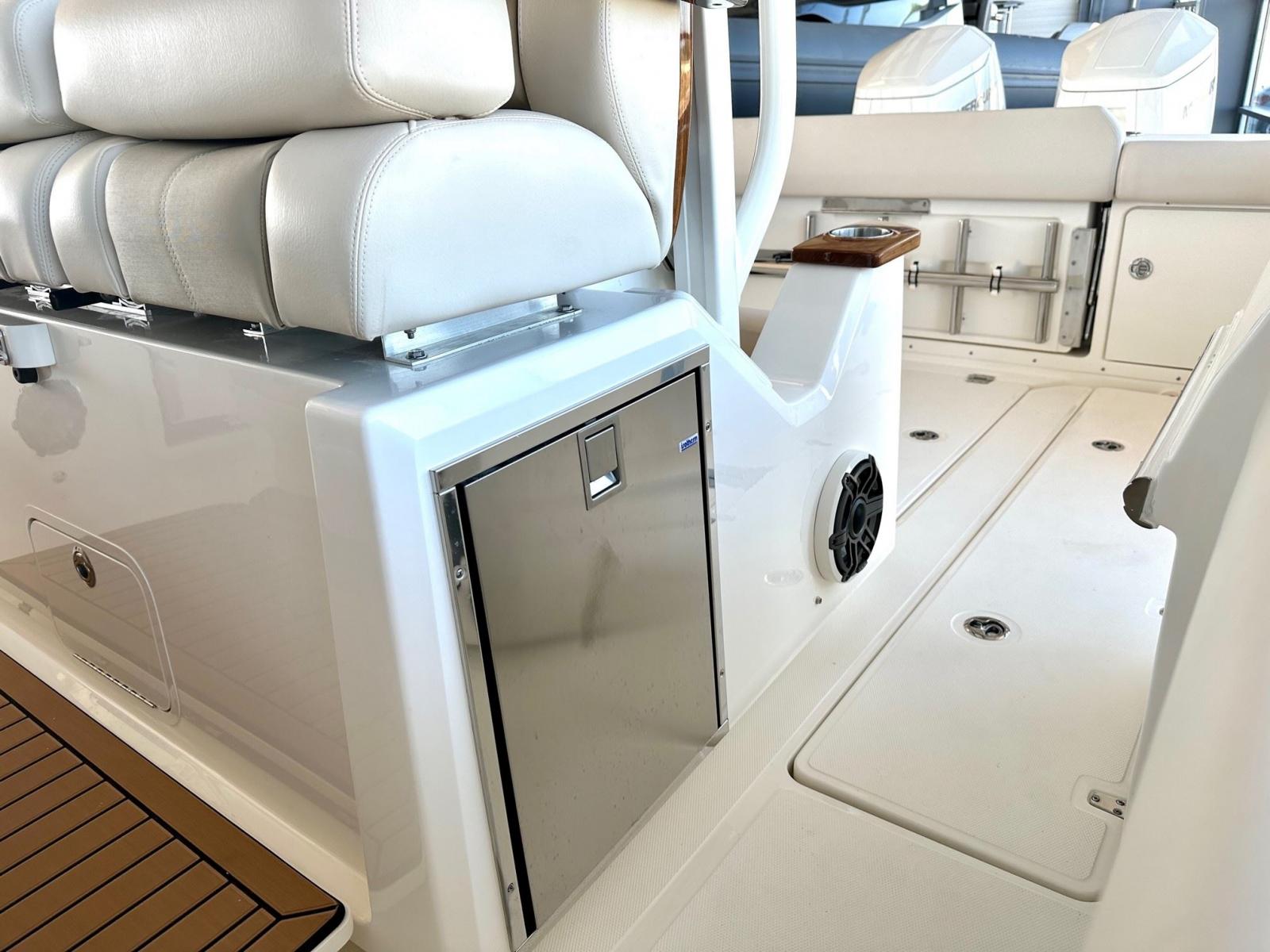 Comfort and Practicality: Port and starboard refrigerators, teak forward table, folding jump seats, 12V outlets at the transom, additional fishing rod racks in the cabin.