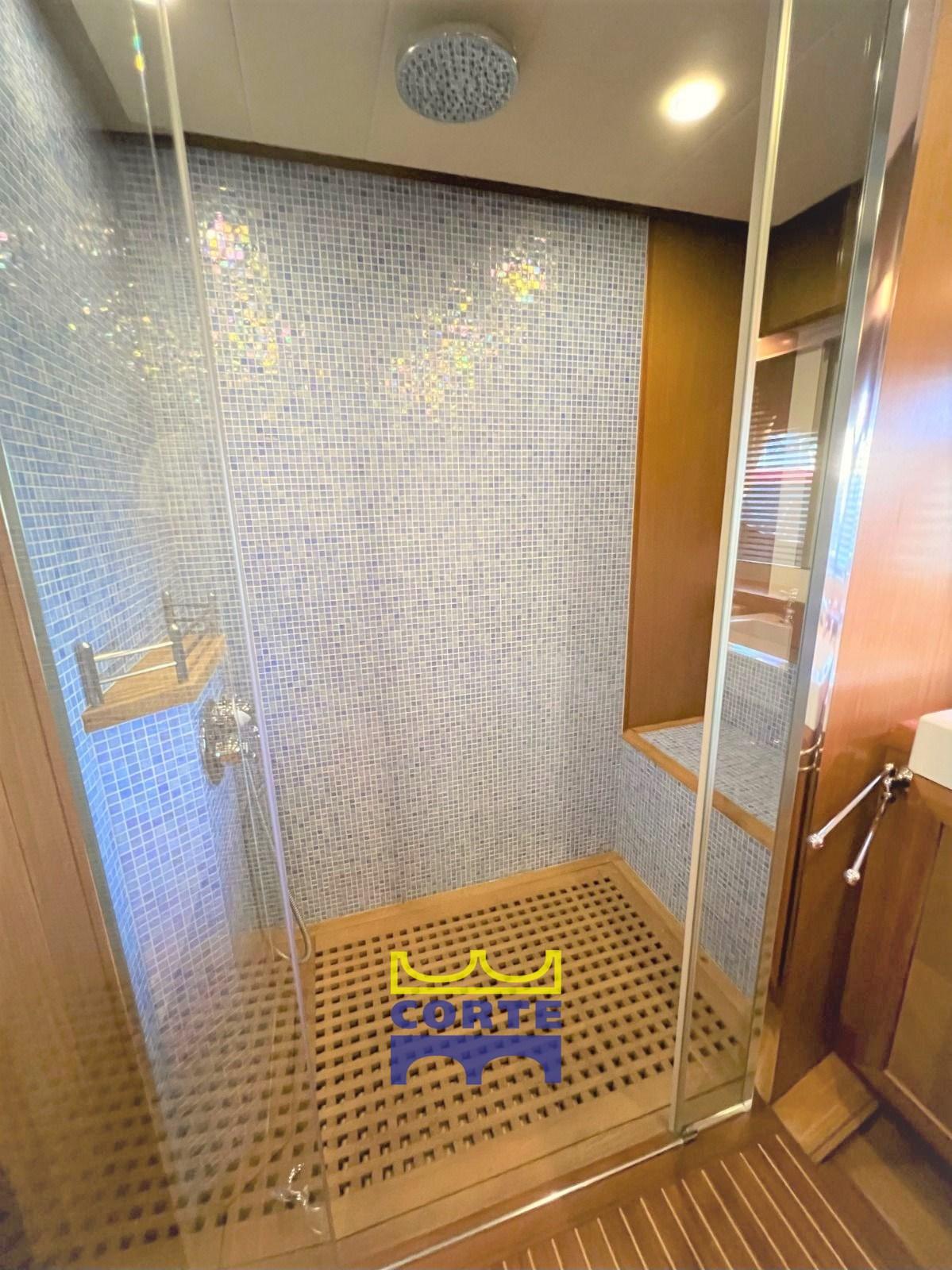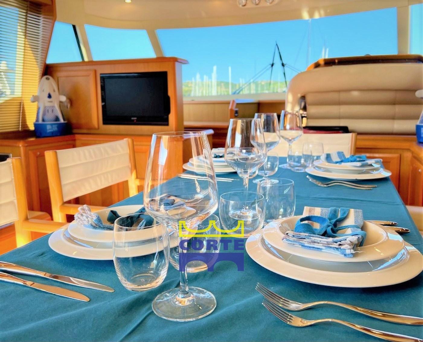 Alarme moteur, Alarme de pompe de cale, Ancre (Bruce inox), Eau sous pression, Passavant en teck, Couleur spéciale (azzurro), Douche de cockpit, Double barre à roue, Phare de poursuite, Flaps hydrauliques, Garage à annexe (ad apertura elettroidraulica), Extincteur(s) fixe(s), Lavabo dans le cockpit, Éclairage de courtoisie, Spots sous-marins (sotto plancetta di poppa), Passerelle (elettroidraulica a scomparsa), Plateforme arrière (poppa per bagno), Pompe de cale automatique, Porte latérale, Cockpit en teck, Prise de quai, Connexion eau sous pression à quai, Répétiteur électronique, Guindeau électrique, Echelle de bain, Stabilisateurs (Arg Mitsubishi), table de cockpit (con 2 divani), Annexe (recente con alaggio facilitato), Corne, Winch électrique (prua), 2 Winch électrique arrière, Winch électrique avant.