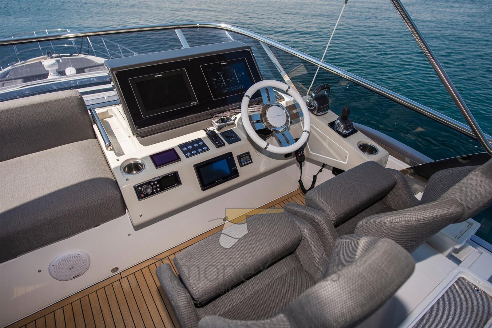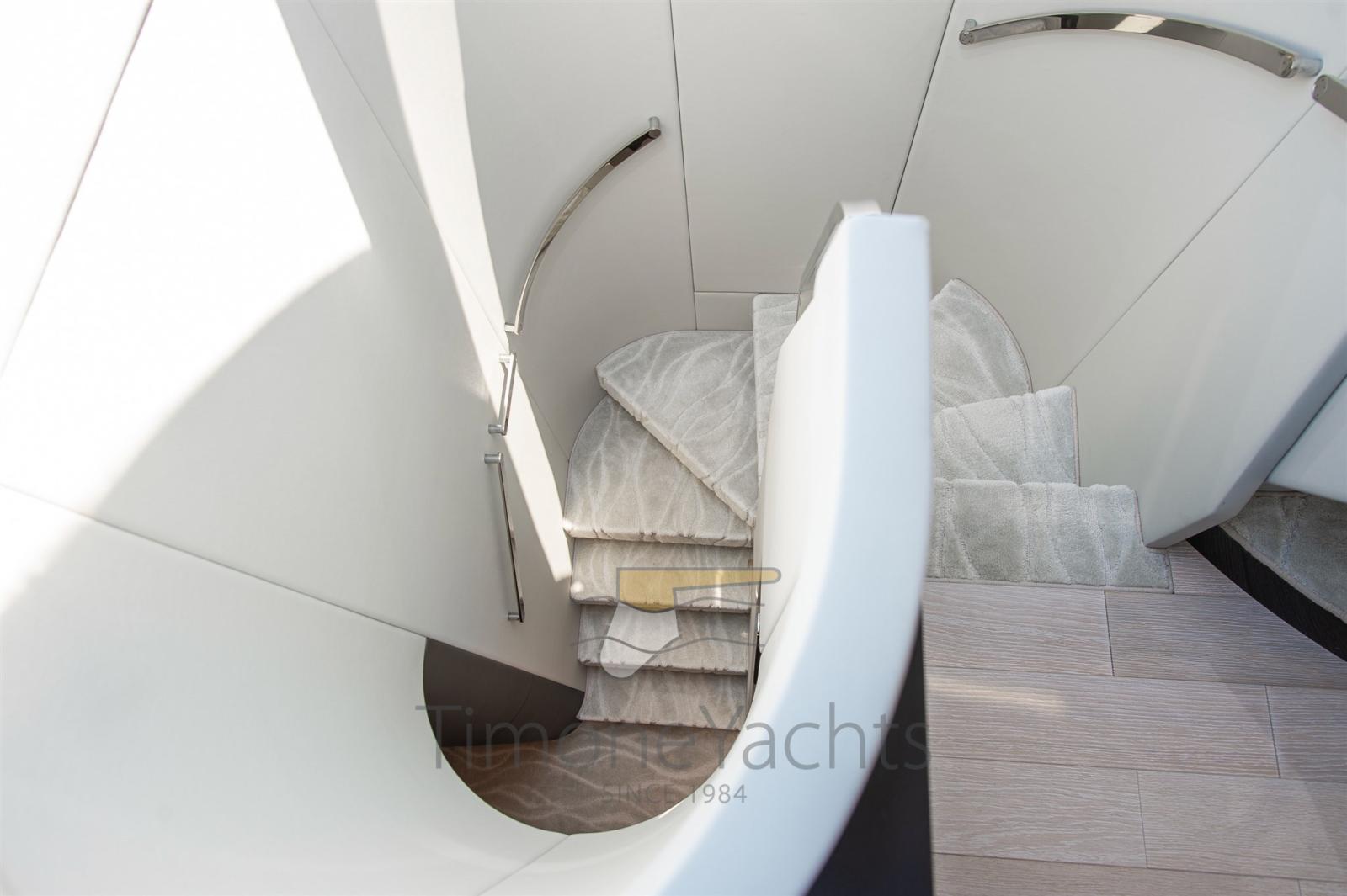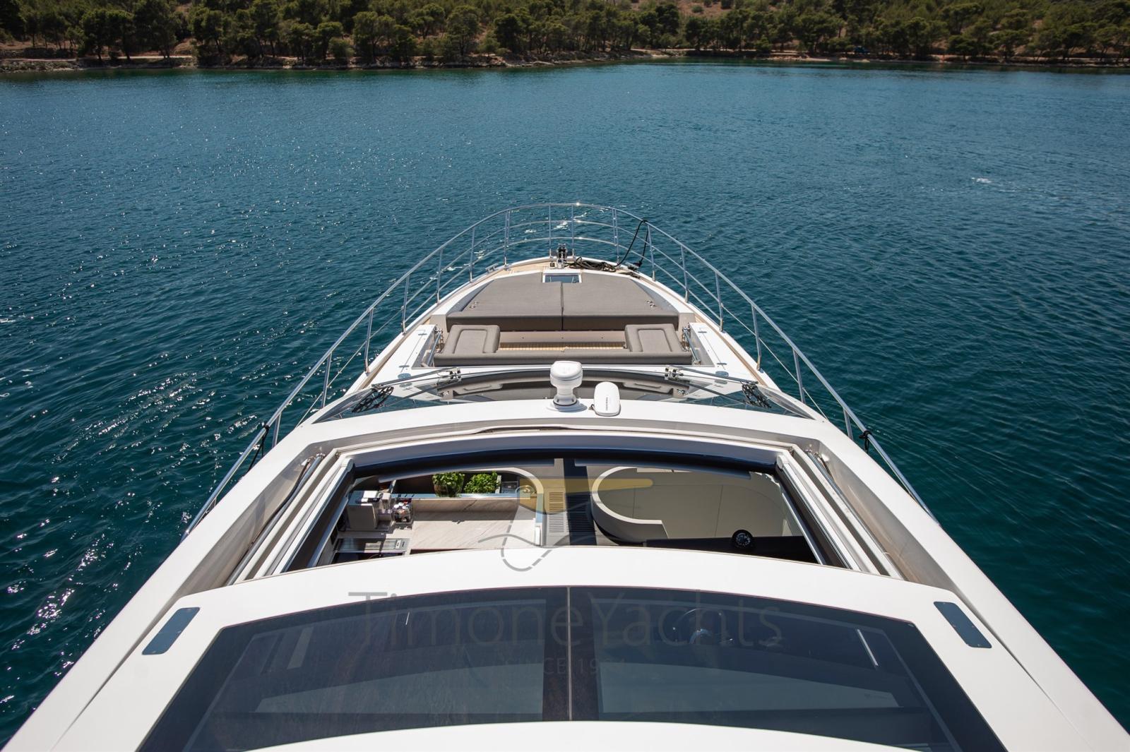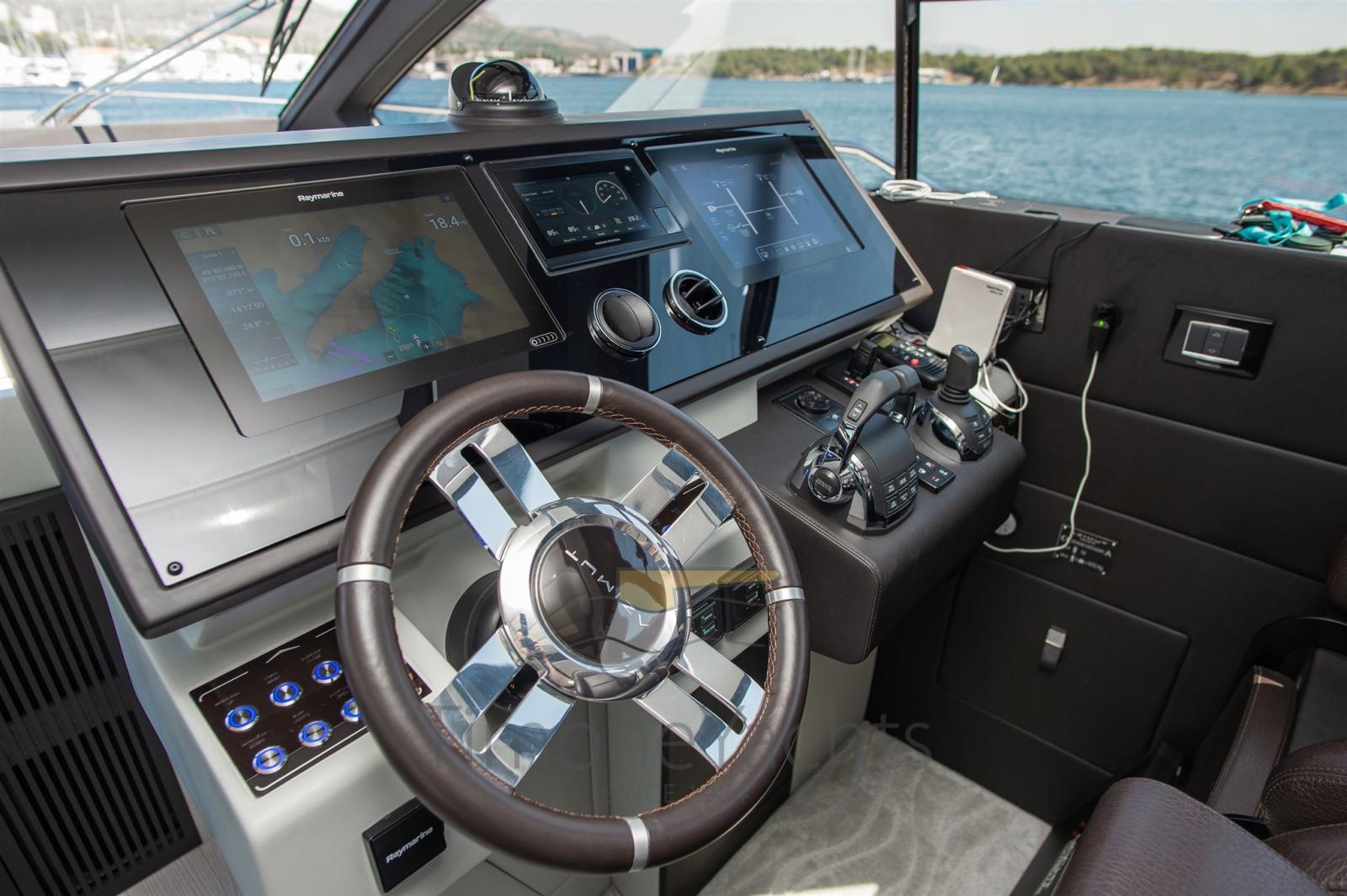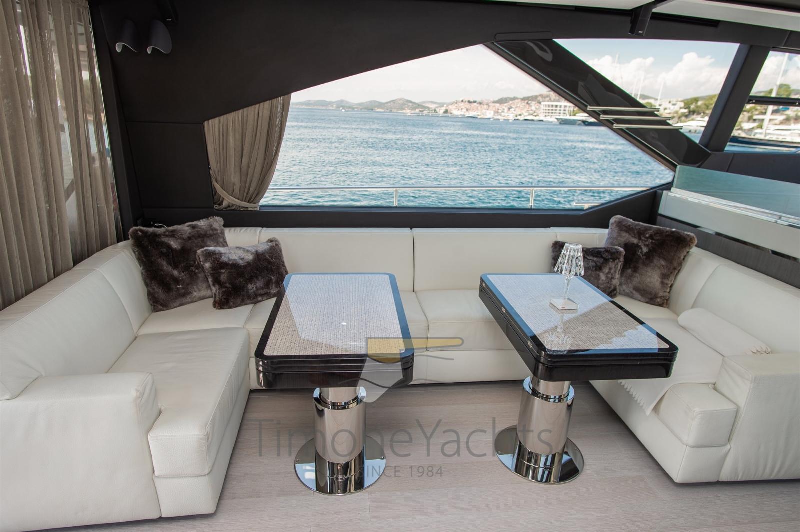 Trim hydraulique, Passavant en teck, Douche de cockpit, Phares fixes arrière, Phare de poursuite, Flaps électriques, Garage à annexe, Hard top, Extincteur(s) fixe(s), Indicateurs de flaps, Lavage de chaine, Éclairage de courtoisie, Spots sous-marins, Passerelle, Cockpit en teck, Prise de quai, Connexion eau sous pression à quai, Stabilisateurs (Seakeeper NG 16), table de cockpit, Corne, 2 Winch électrique arrière, Winch électrique avant.