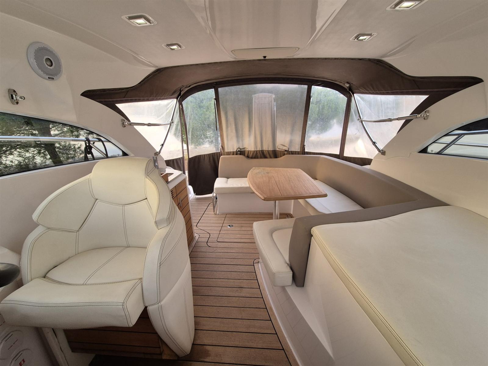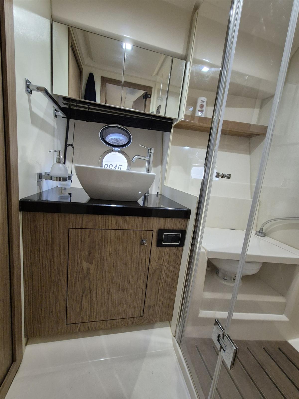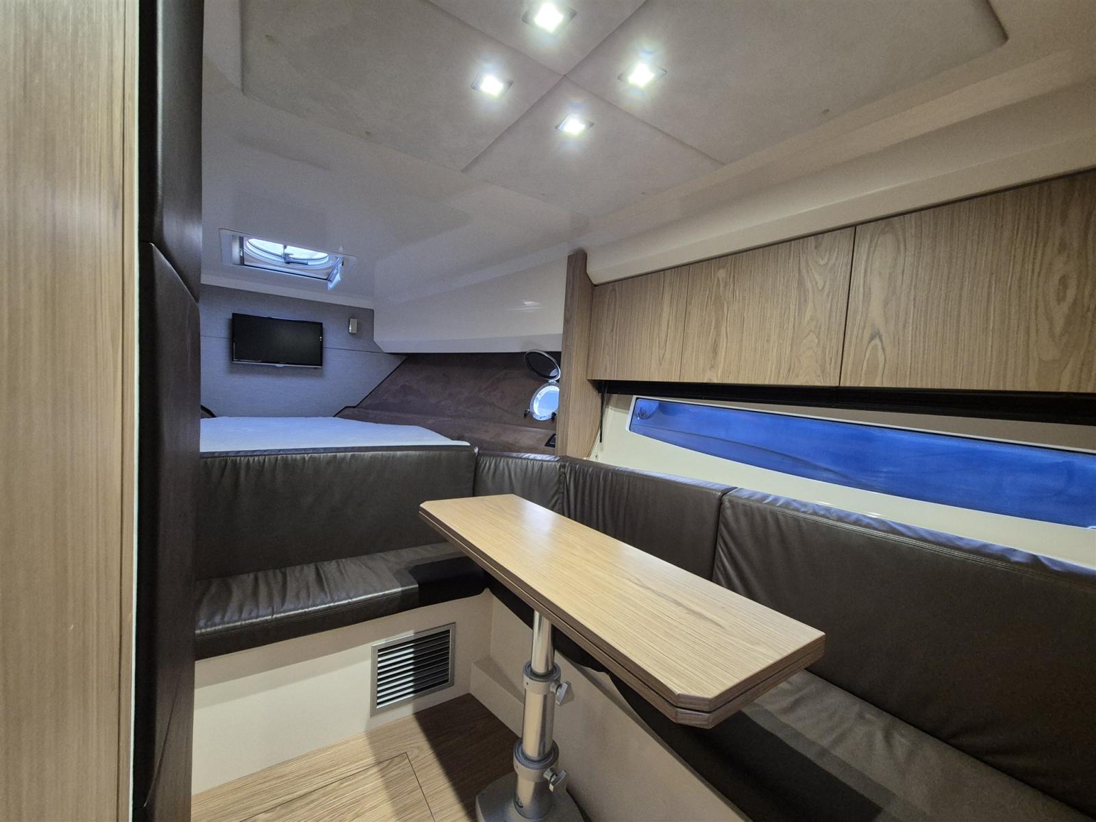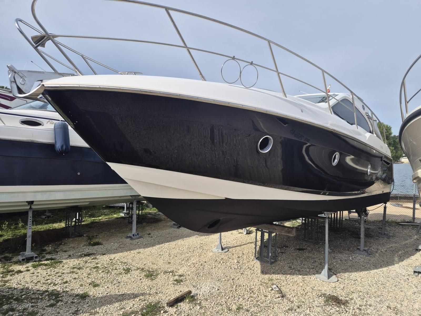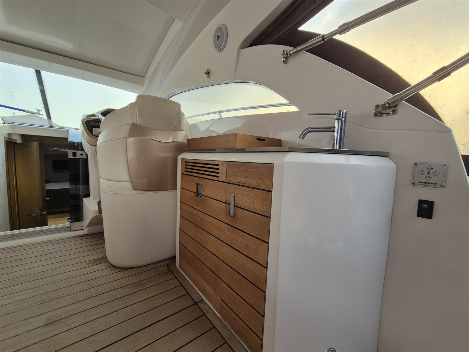 Alarme moteur, Alarme de pompe de cale, Alternateur, Ouverture du compartiment moteur électrique, Eau sous pression, 5 Batteries (New 3/2026), Câble d’alimentation à quai, Couleur spéciale, Douche de cockpit, Propulseur d'étrave (Sidepower), Flaps électriques (Zipwake), Hard top, Extincteur(s) fixe(s), Indicateurs de flaps (Zipwake display), Éclairage de courtoisie, Défenses, Passerelle (Besenzoni), Plateforme arrière, Pompe de Vidange du Réservoir d’Eaux Usées, Pompe de cale automatique, Pompe de cale manuelle, Cockpit en teck, Prise de quai, Guindeau électrique, Echelle de bain, table de cockpit, Table pliante de salon, Corne.