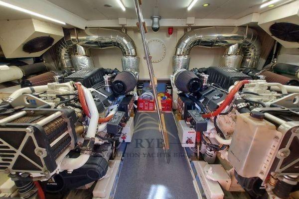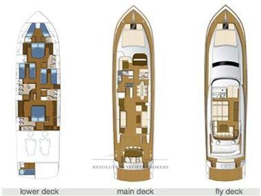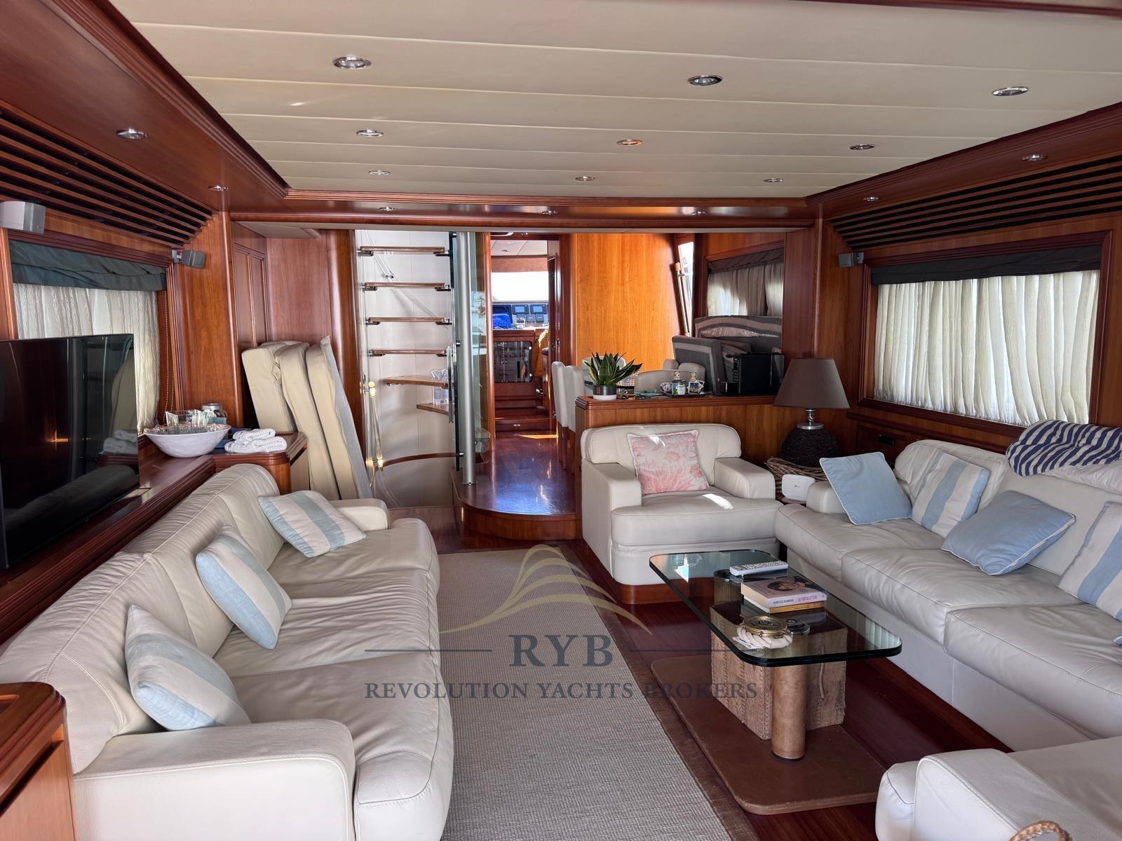 Eau sous pression, Passavant en teck, 2 Chargeur de batterie (MASTERVOLT Plus 24/110-2), Phare de poursuite, Flaps hydrauliques, Grue de flybridge, Éclairage de courtoisie, Passerelle (IDRAULICA A SCOMPARSA), Plateforme arrière (TEAK), Porte latérale, Cockpit en teck, Répétiteur électronique (FLY), Rollbar, Echelle de bain, Selles pour Annexe, table de cockpit, 2 Winch électrique arrière (Maxwell 1500w).