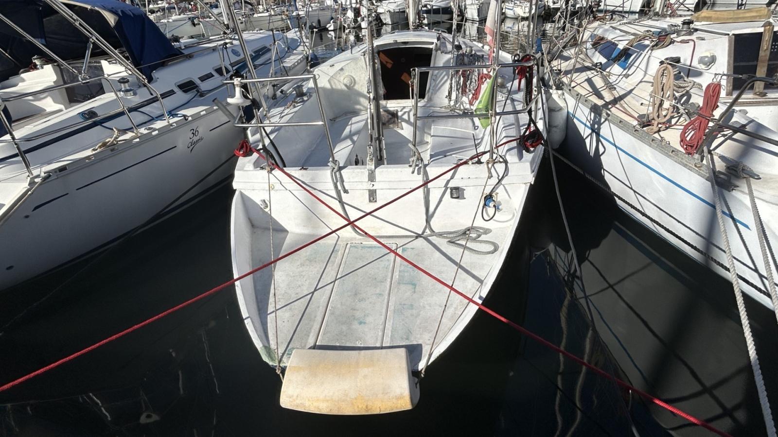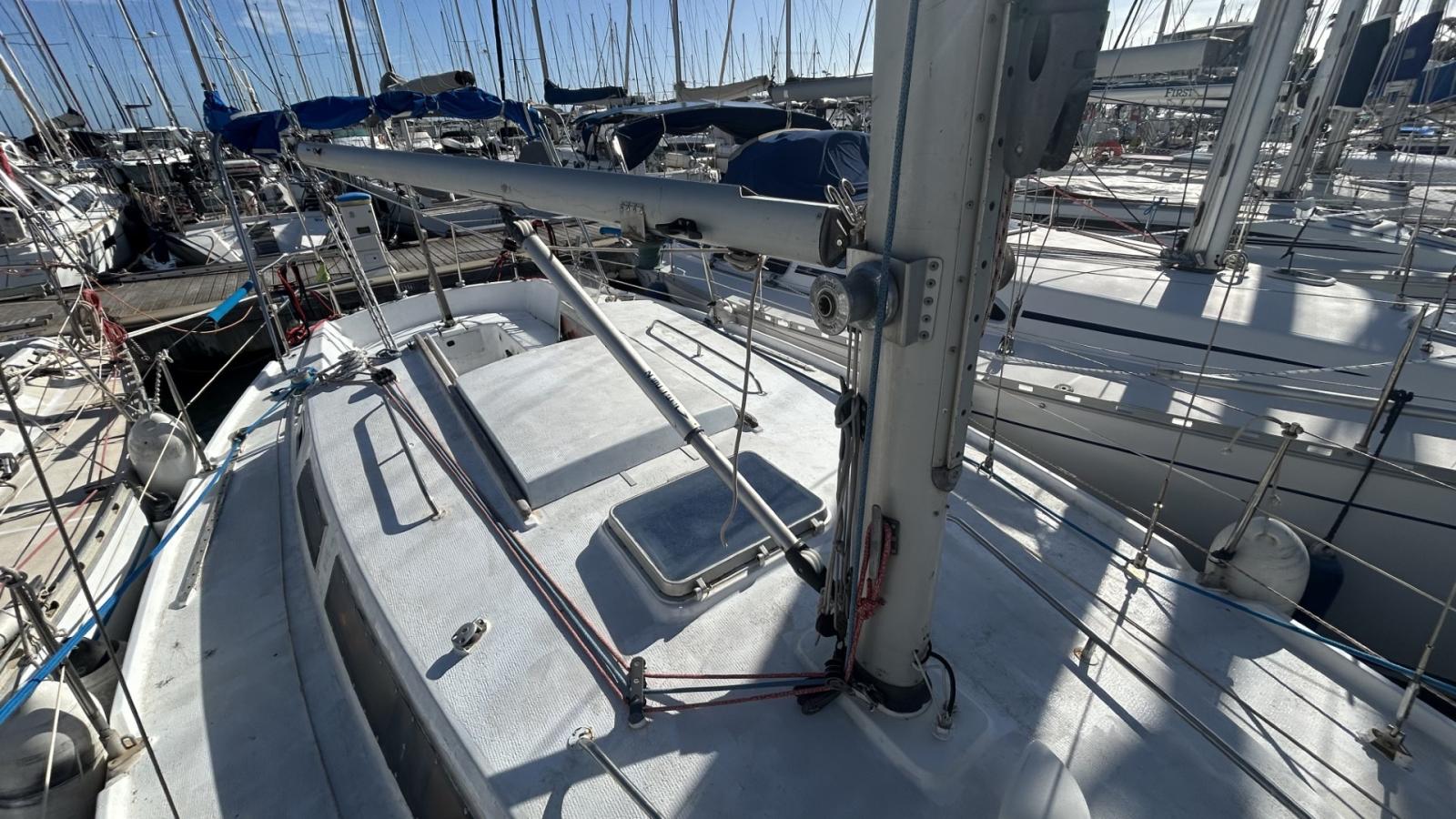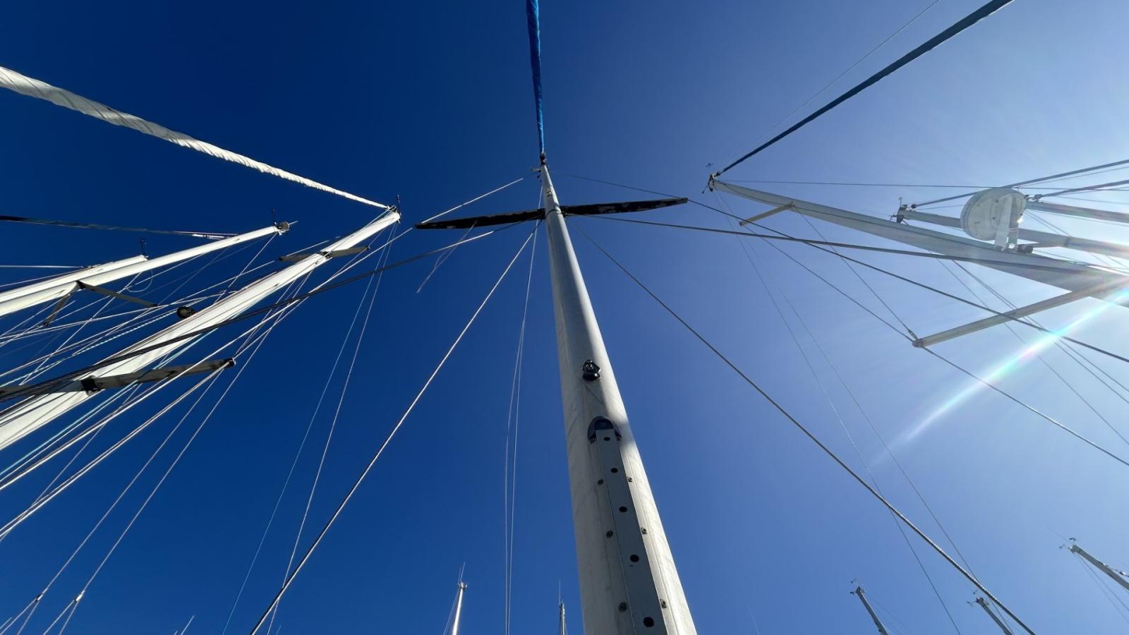 Voilier équipé d’un génois sur enrouleur, grand-voile, tourmentin, rail d’écoute de grand-voile & d'écoute de génois, renvoi de drisses au cockpit, 5 winchs, barre franche. Gréement simple et fonctionnel, adapté à la croisière côtière.
