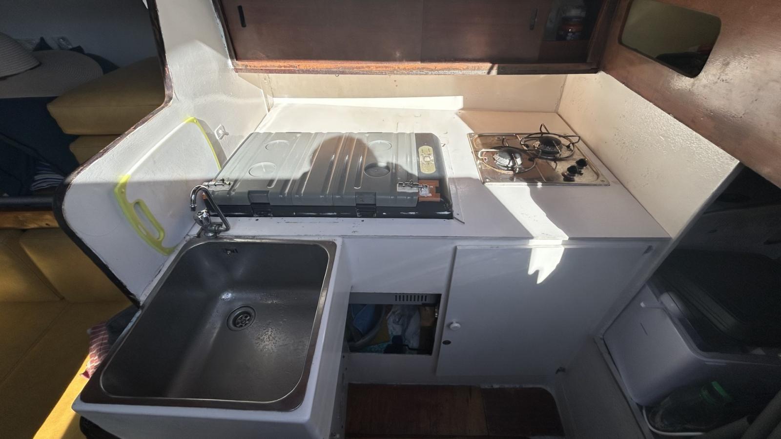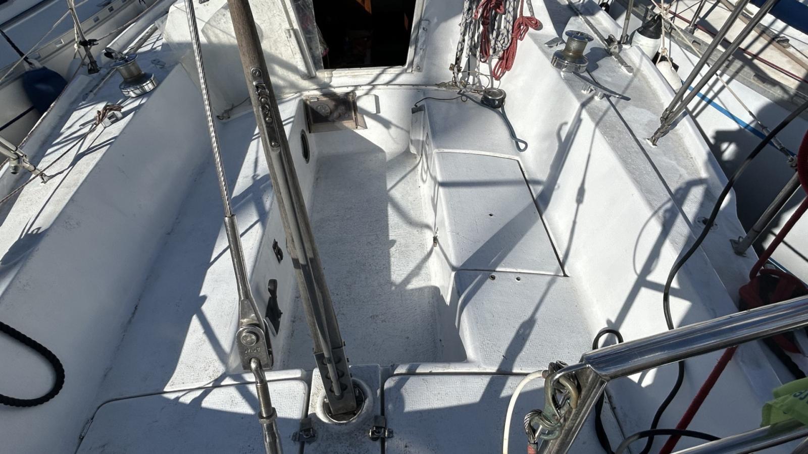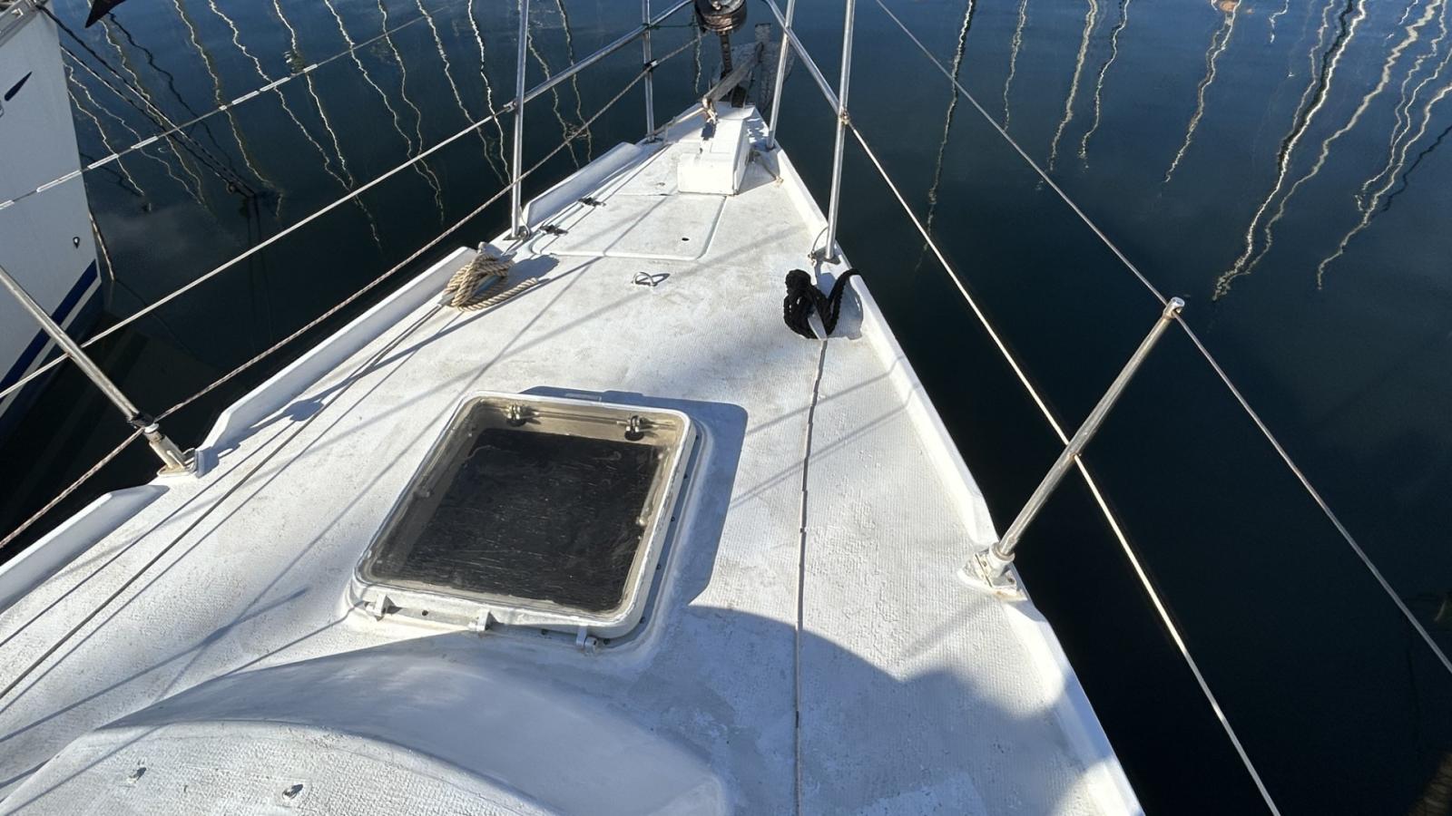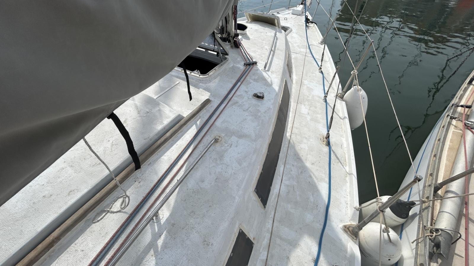 Voilier équipé d’un génois sur enrouleur, grand-voile, tourmentin, rail d’écoute de grand-voile & d'écoute de génois, renvoi de drisses au cockpit, 5 winchs, barre franche. Gréement simple et fonctionnel, adapté à la croisière côtière.
