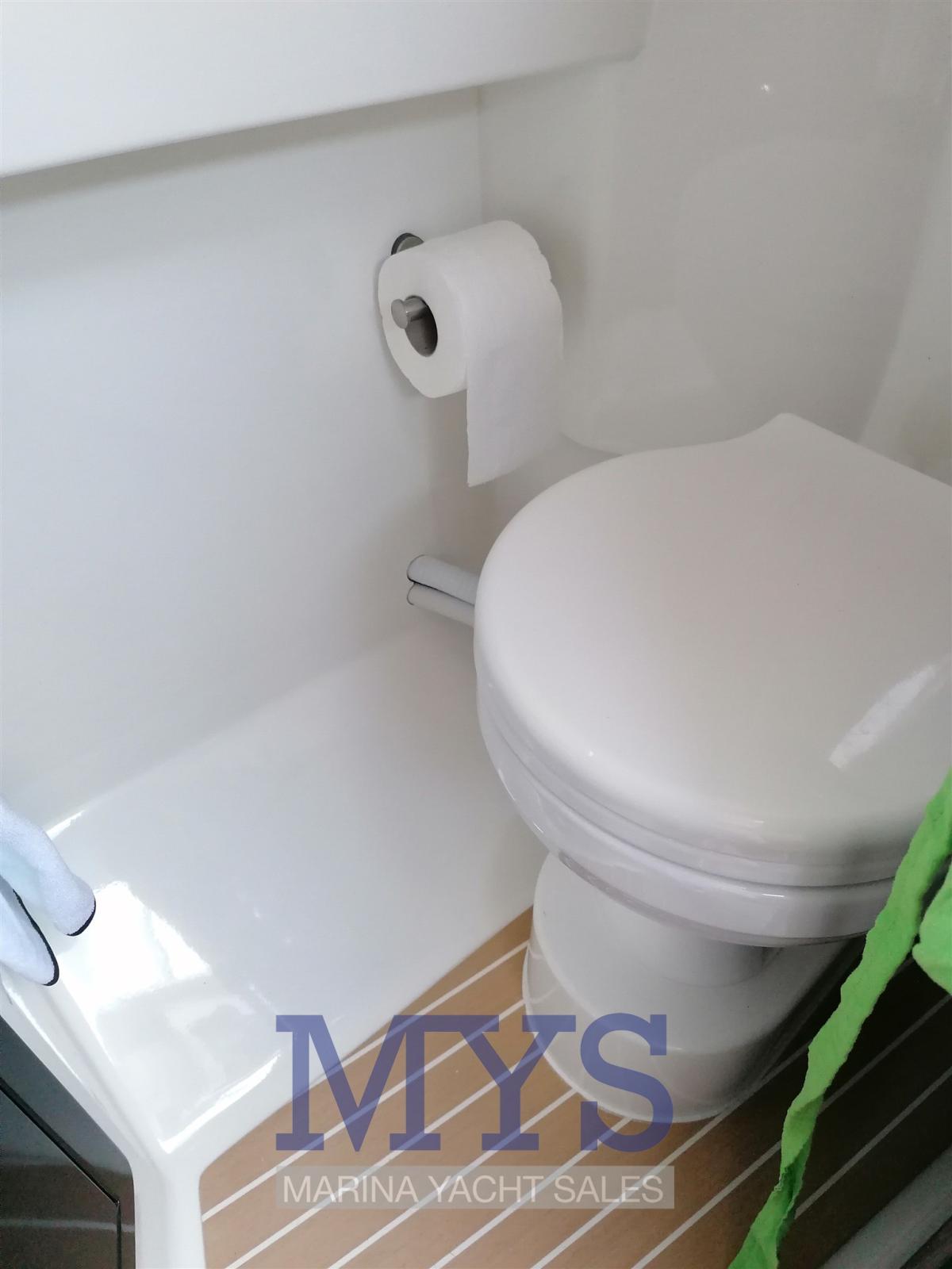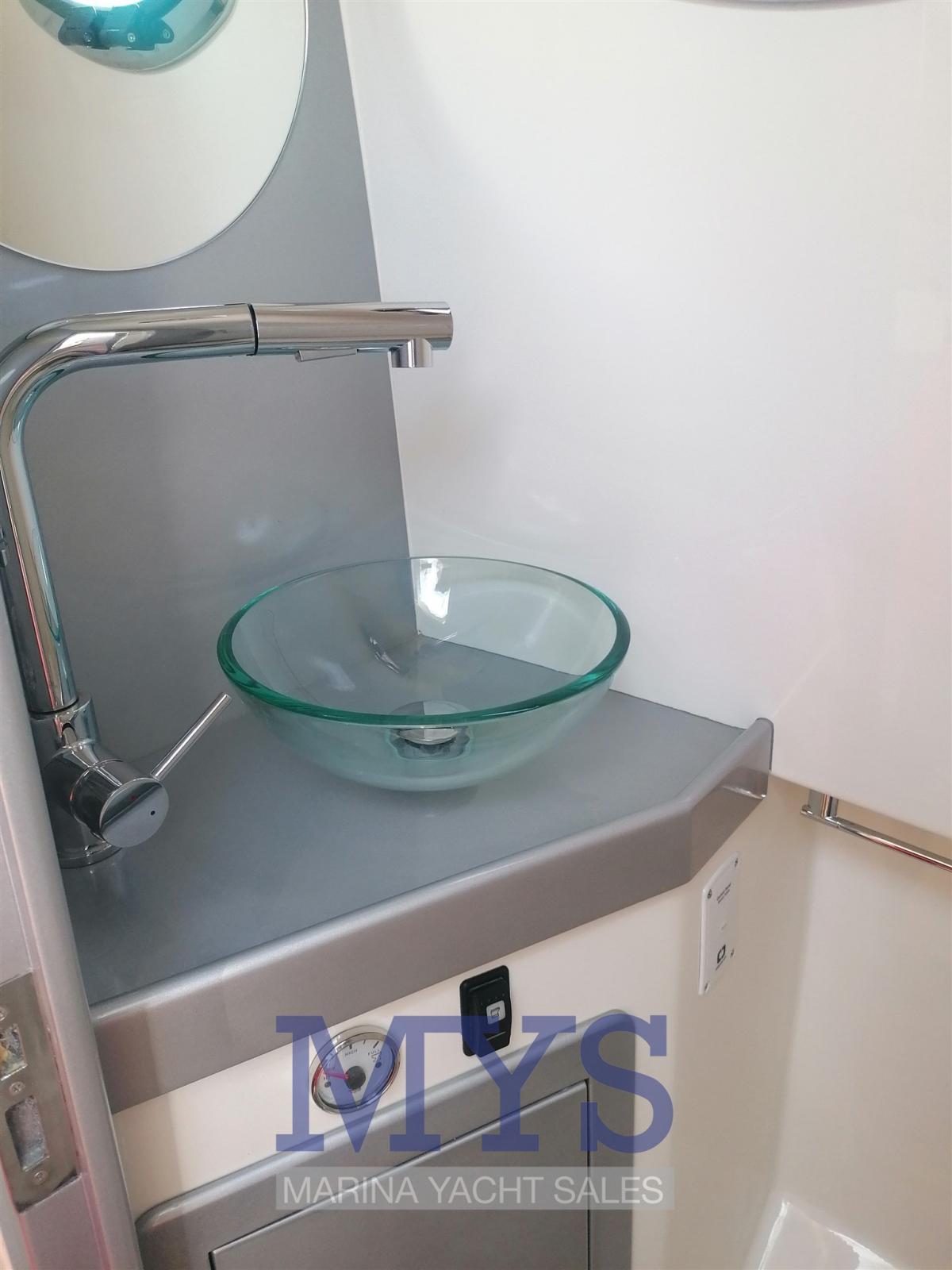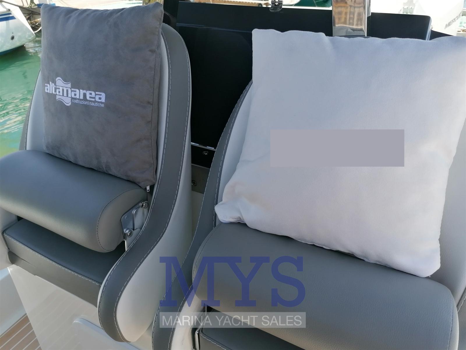 Alarme moteur, Ouverture du compartiment moteur électrique, Eau sous pression, Douche de cockpit, Éclairage de courtoisie, Spots sous-marins, Plateforme arrière, Pompe de cale automatique, Pompe de cale manuelle, Cockpit en teck, Prise de quai, Guindeau électrique, Echelle de bain, Table, Corne.