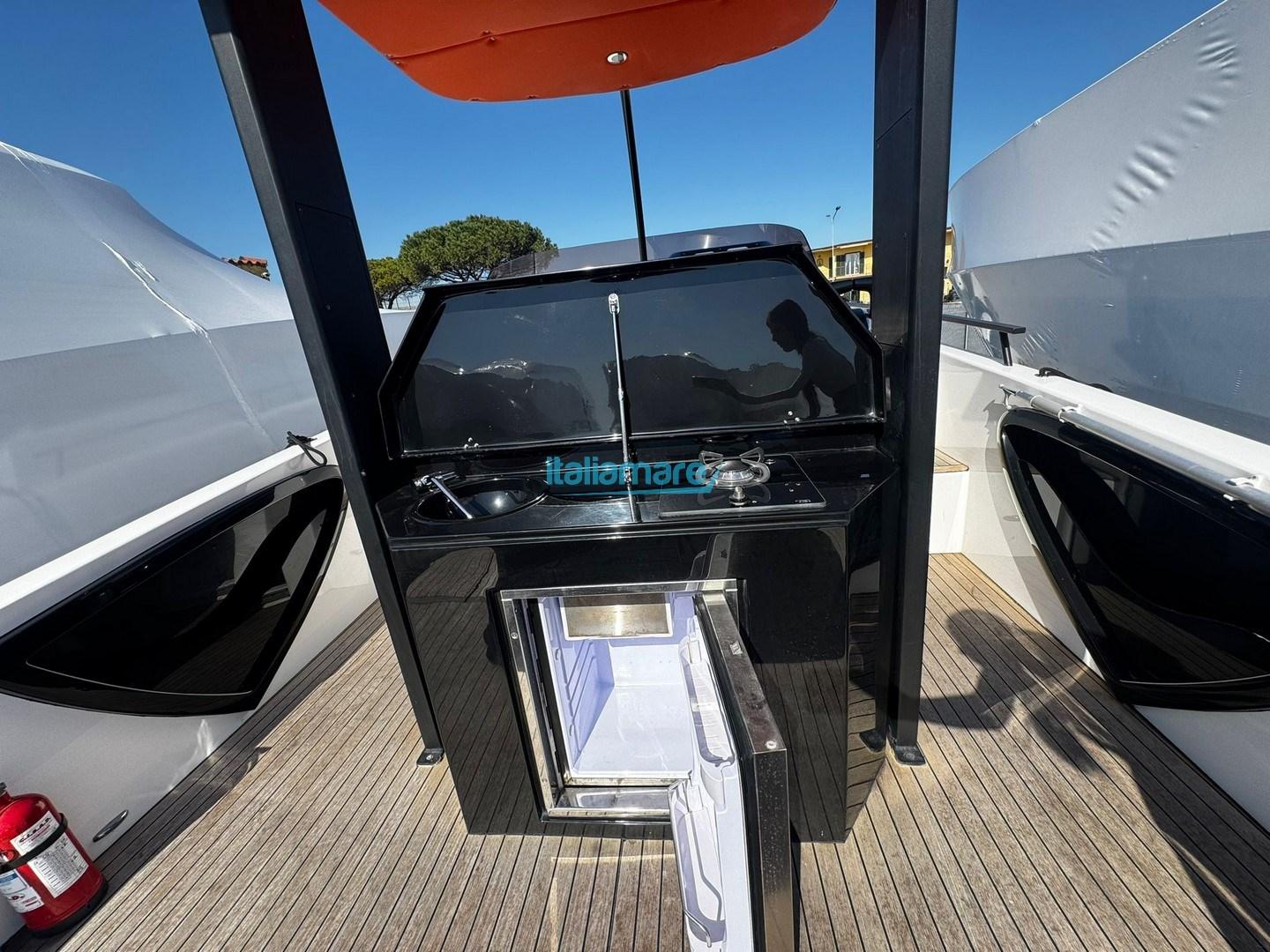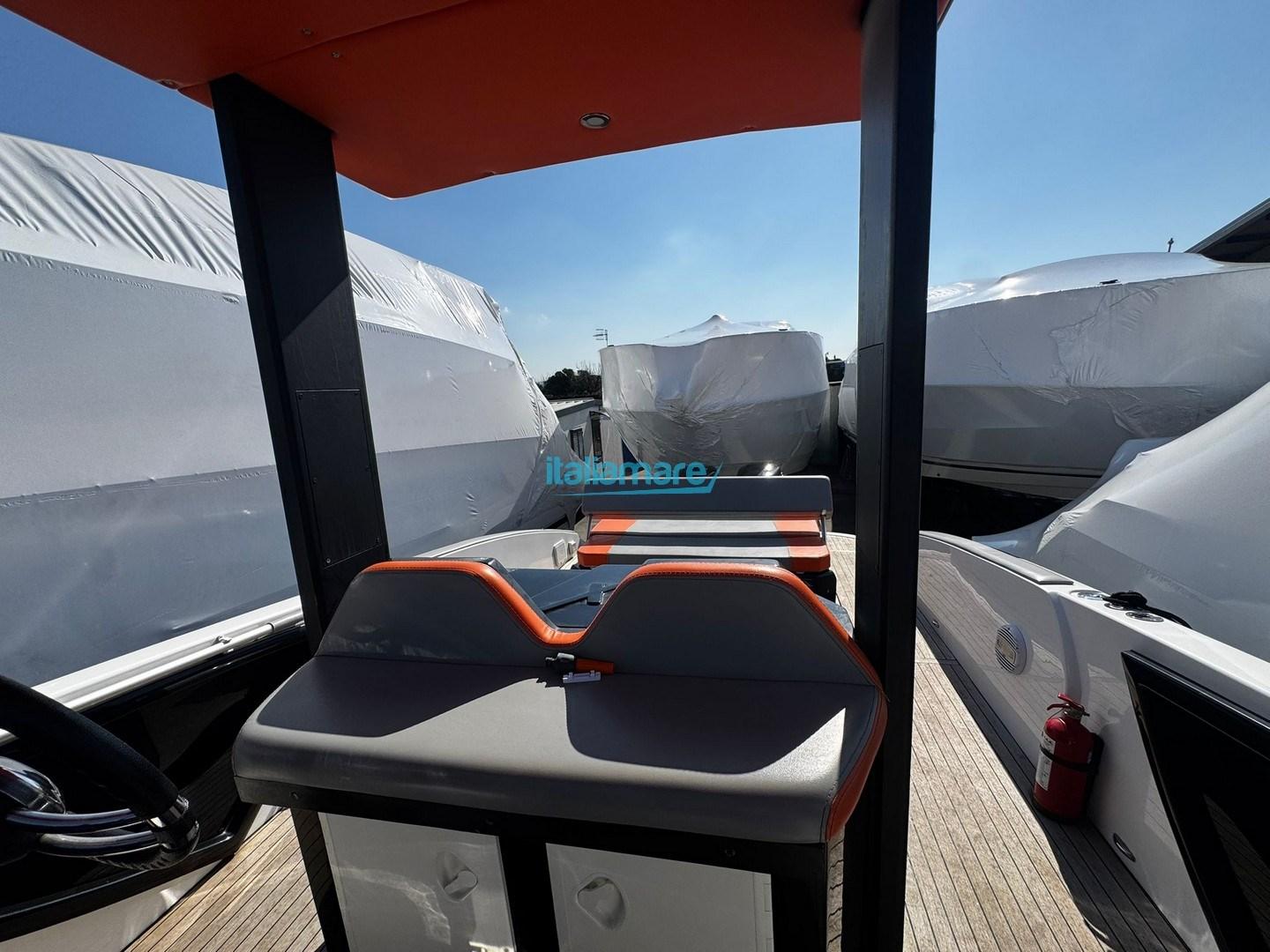 Accessoires principaux : GPS - Propulseur avant - Plateforme en teck - Cockpit en teck - T-top - Haut-parleurs - Chaîne stéréo - Housse de console - Housse de siège - Auvent