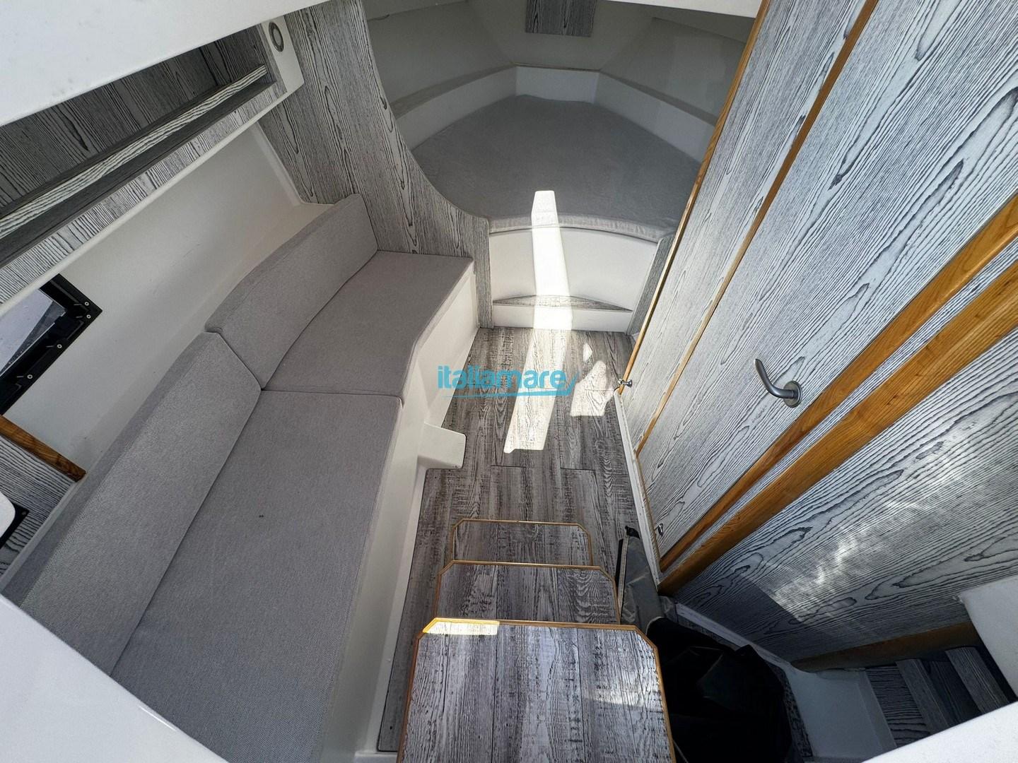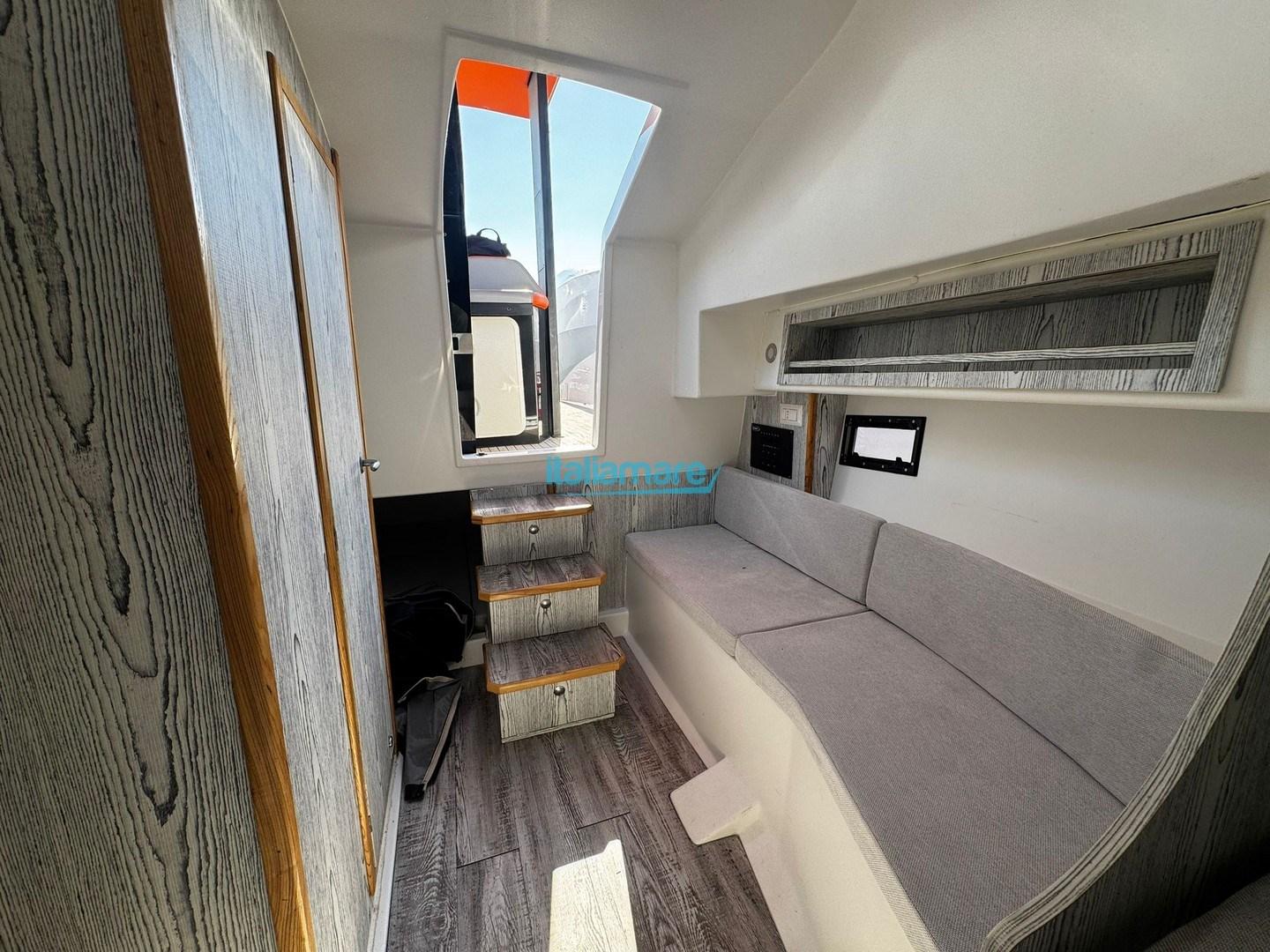 Sous le pont, le bateau surprend par une habitabilité inattendue : il propose quatre couchettes réparties entre la cabine à manger avant décapotable et une cabine arrière double, complétée par une cabine séparée garantissant l’intimité nécessaire.