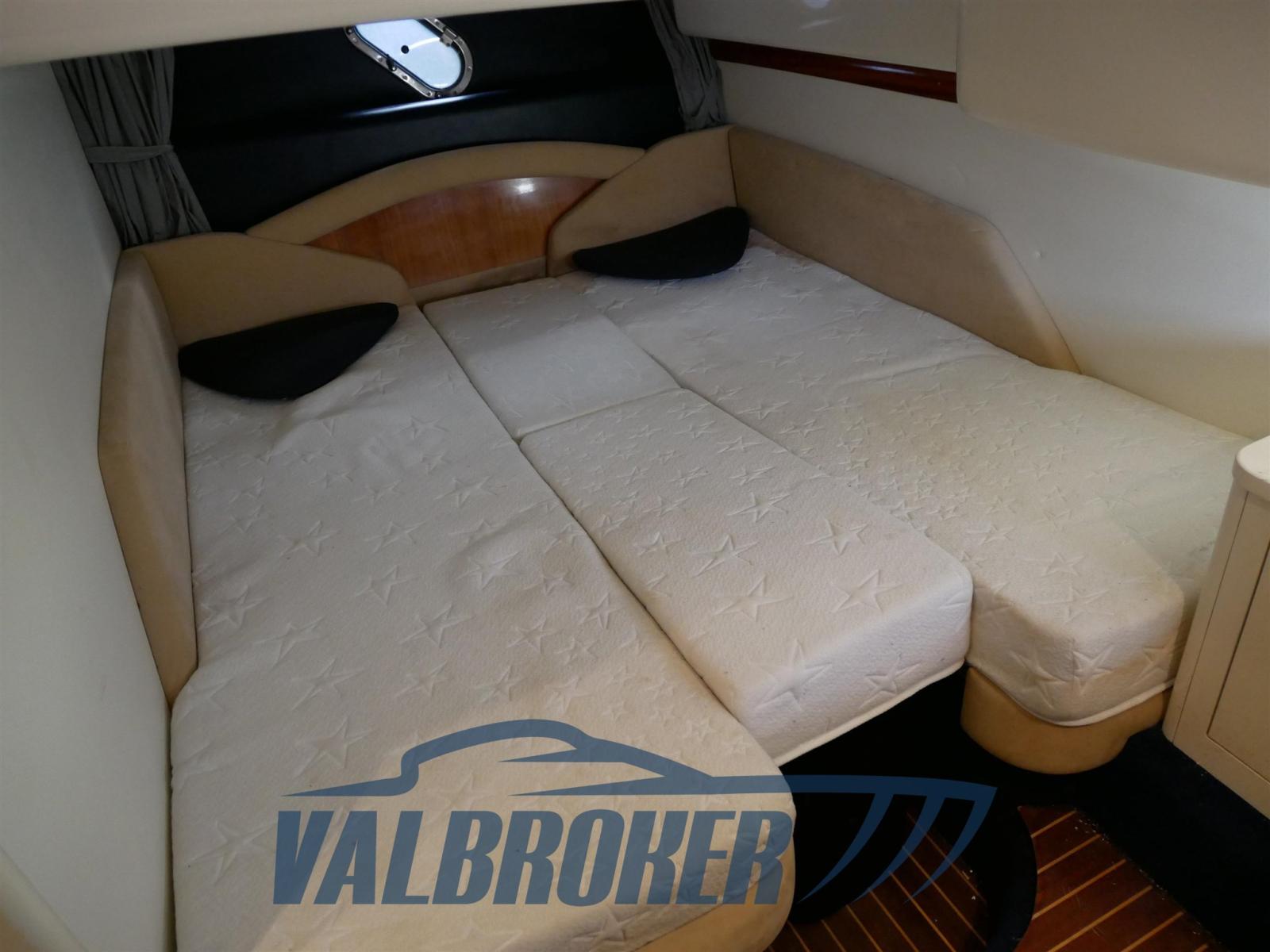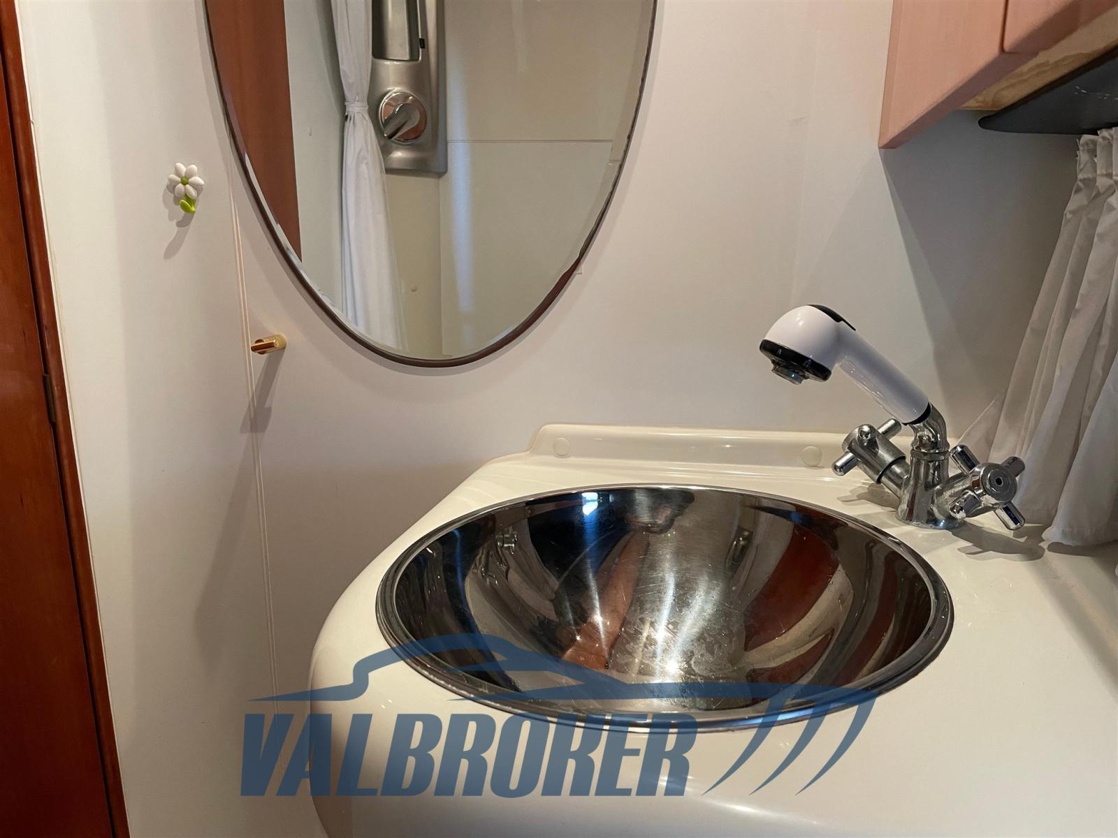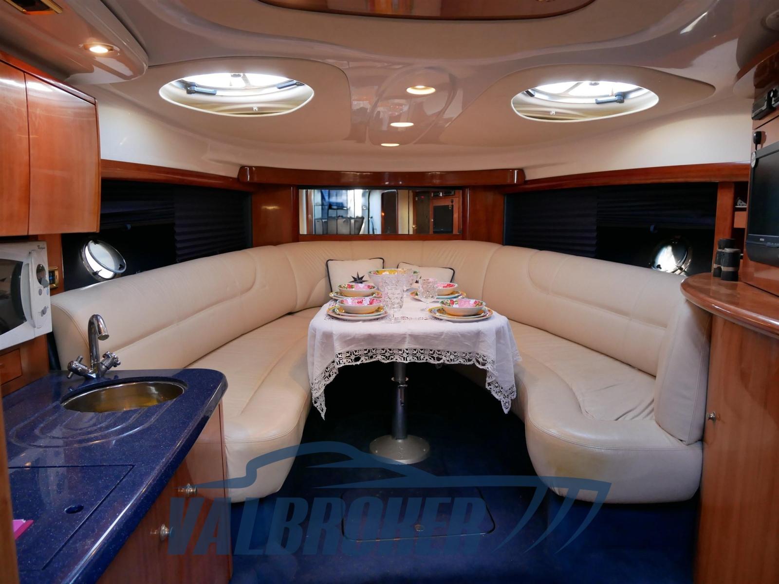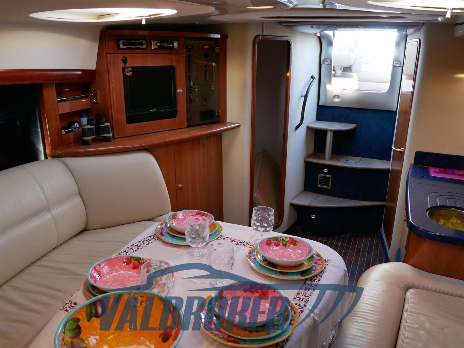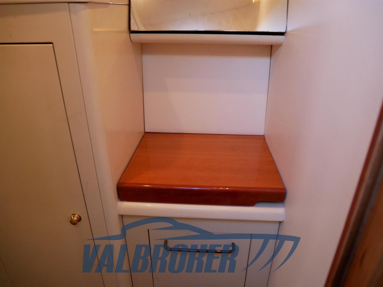 Sous le pont, il y a une spacieuse cabine double arrière, une salle à manger décapotable et une salle de bain avec douche. En option complète : climatisation chaud/froide, pilote automatique, propulseur d’étrave, garage à tender, GPS. Teck synthétique sans entretien.