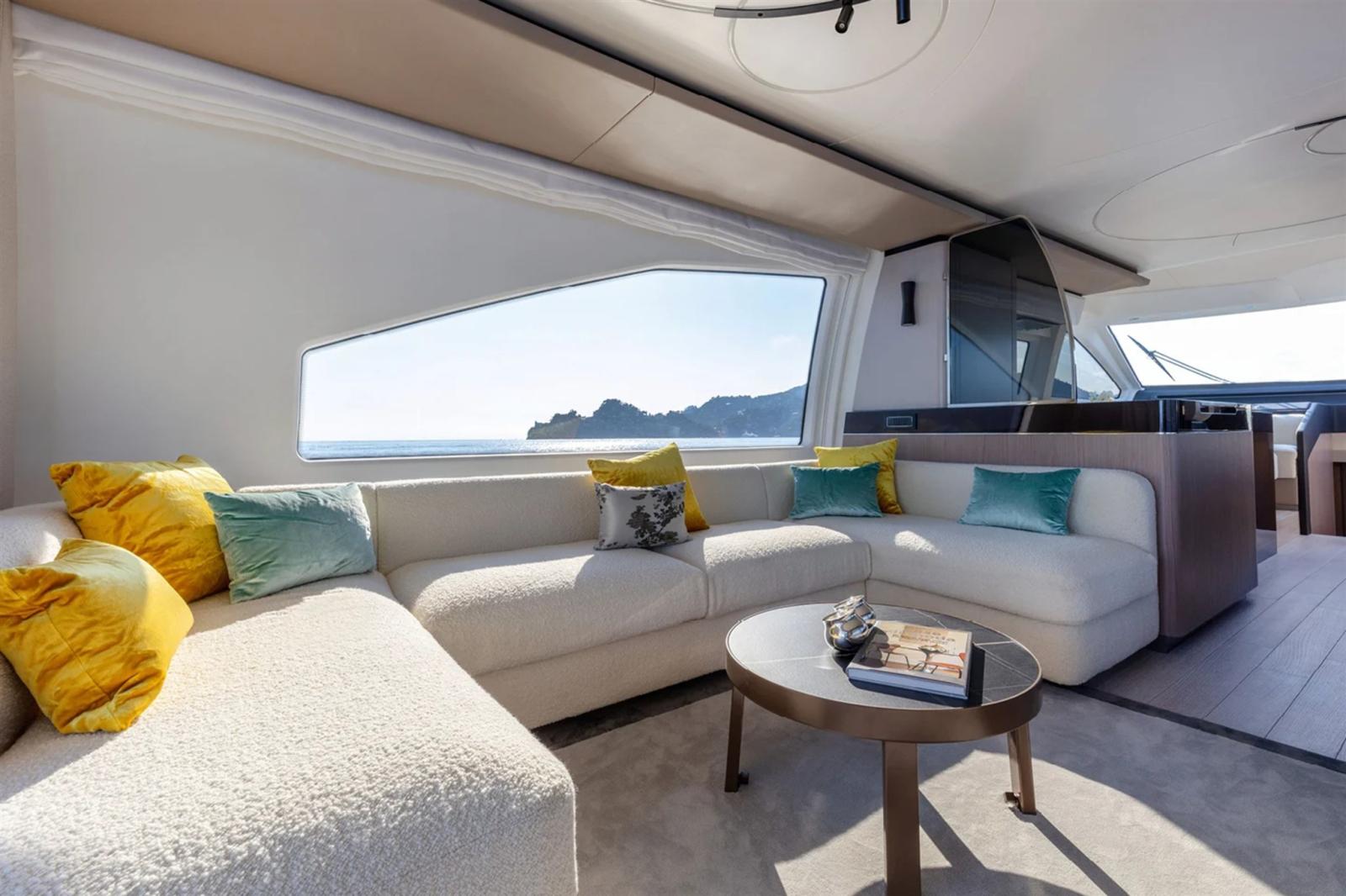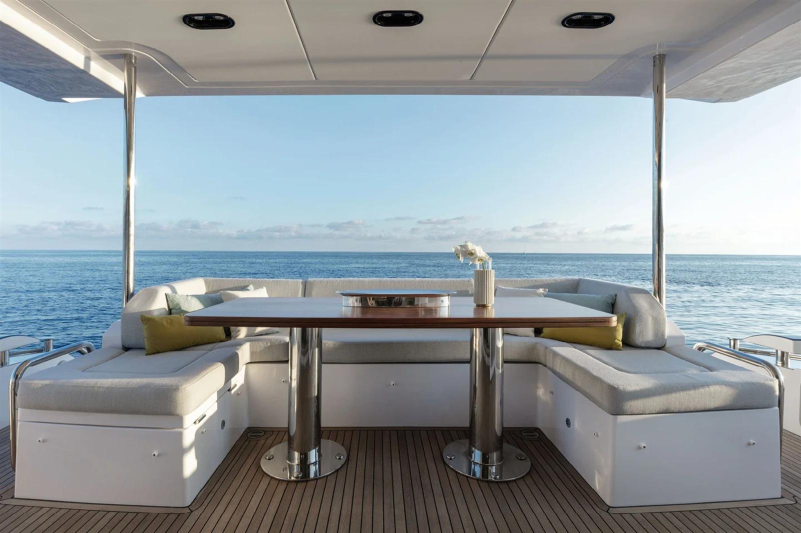 Passerelle d’équipage extrêmement spacieuse avec toit rigide et toit électrique, poste de barre, bar humide, télévision rétractable, un grand canapé en forme de C et une terrasse solaire