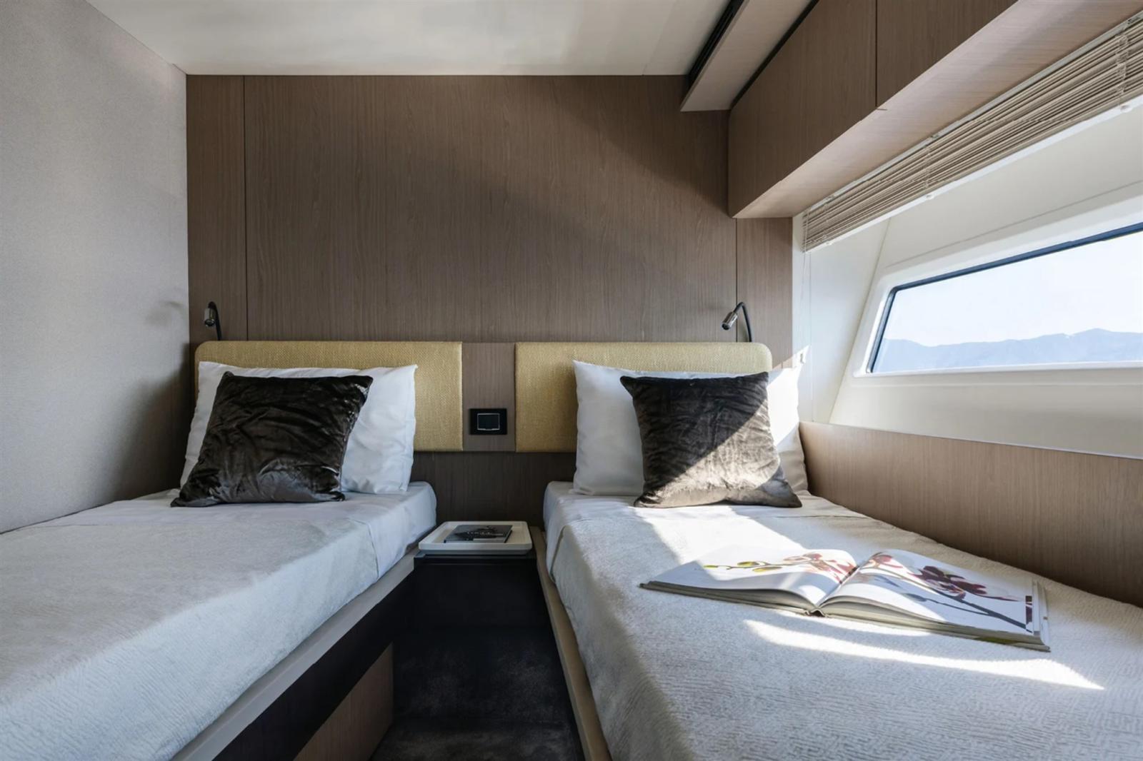Cabines d’amis avec lit double (bâbord) et une cabine avec lits jumeaux (tribord), toutes deux avec salle de bain attenante