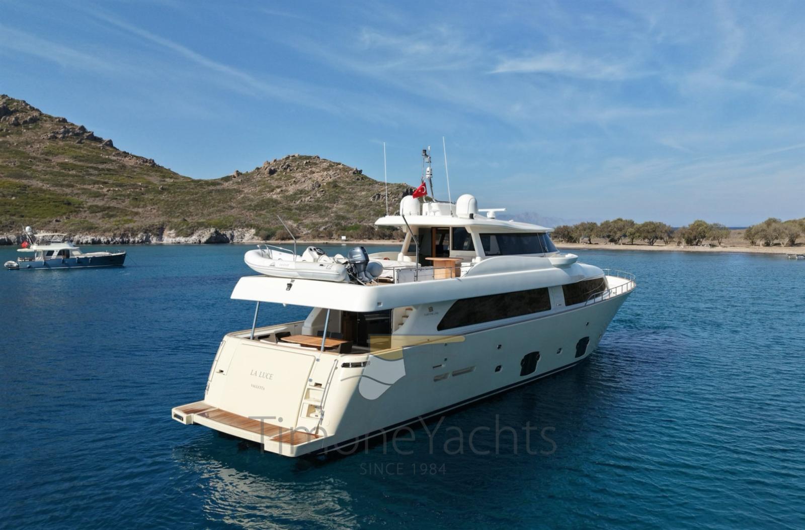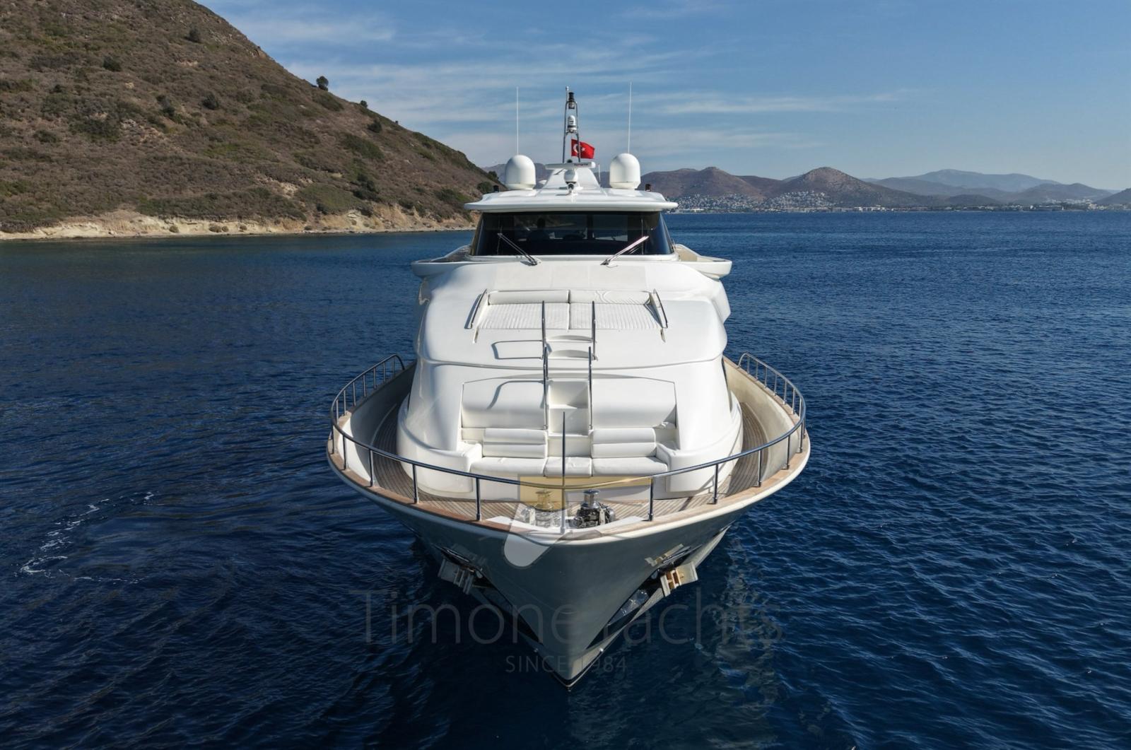 Passavant en teck, Douche de cockpit, Phare de poursuite, Flaps hydrauliques, Garage à annexe, Grue de flybridge, Hard top, Extincteur(s) fixe(s), Indicateurs de flaps, Lavage de chaine, Passerelle, Porte latérale, Cockpit en teck, Prise de quai, Connexion eau sous pression à quai, Système de filtration des eaux usées (HAMANN), Stabilisateurs (TRAC), Annexe, Corne, Winch électrique arrière.