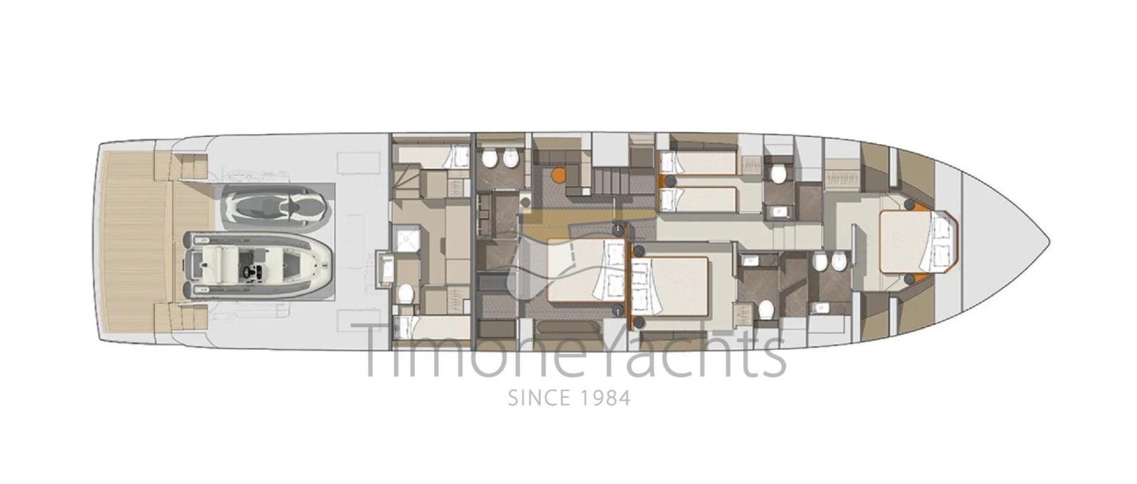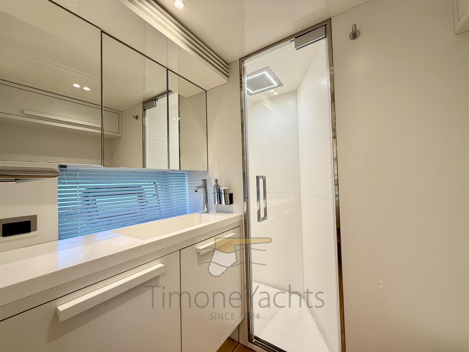 Alarme gaz, Alarme moteur, Alarme de pompe de cale, Alternateur, Auto Dynamic Trim Interceptor, Eau sous pression, Passavant en teck, 2 Douche de cockpit, Double barre à roue, Flaps électriques, Garage à annexe, Hard top (Con lamelle in alluminio regolabili), Compresseur de plongée, Lavage de chaine, Passerelle, Plateforme arrière, Pompe de cale automatique, Pont en teck, Porte latérale, Porte latérale, Cockpit en teck, Prise de quai, Connexion eau sous pression à quai, Guindeau électrique, Echelle de bain, Stabilisateurs (Pinne stabilizzatrici), table de cockpit, Corne, Winch électrique arrière, Winch électrique avant.