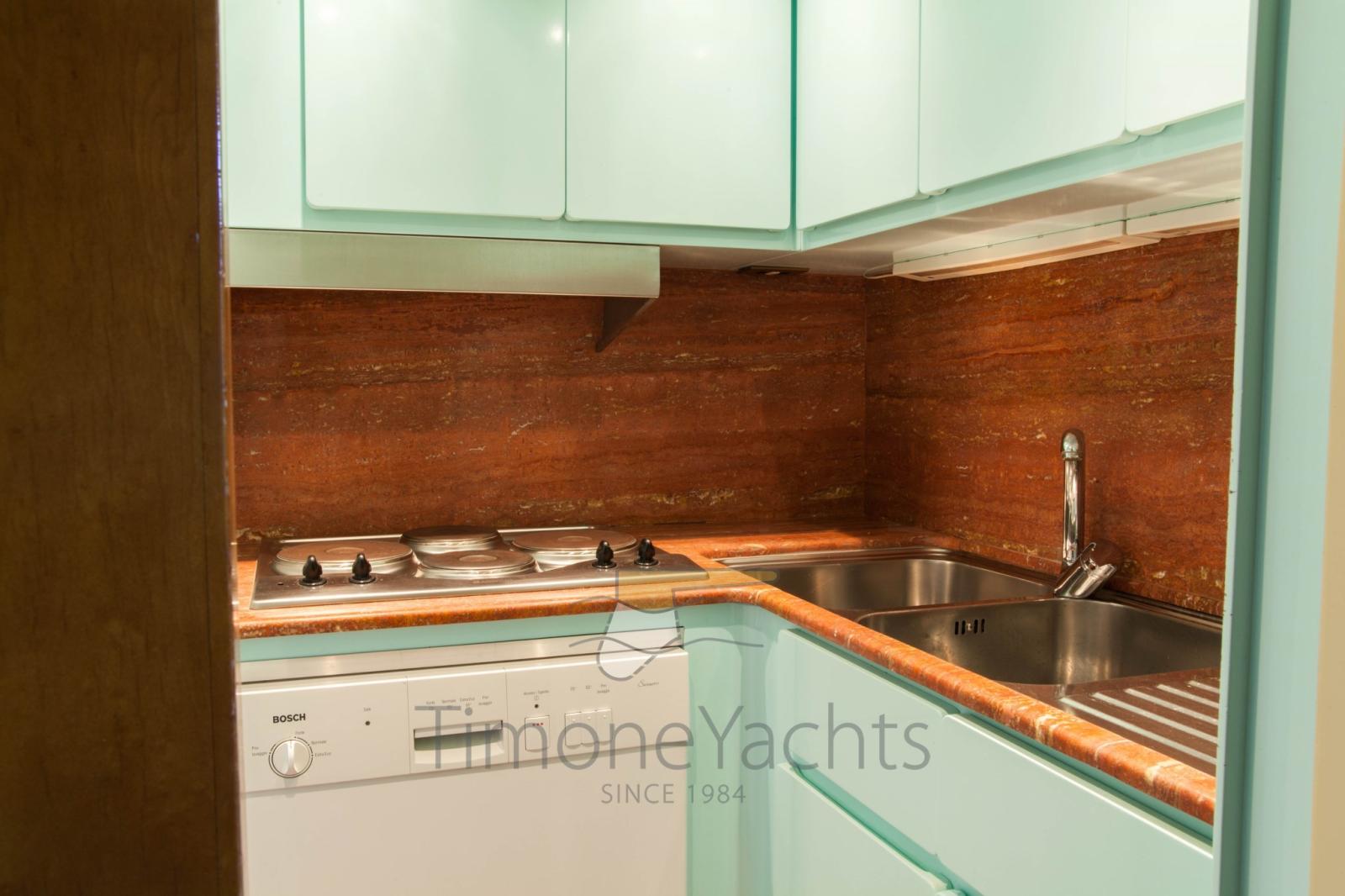 Les volumes sont abondants, tout comme le confort à bord. Il peut accueillir 12 invités dans 5 cabines + 6 membres d’équipage dans 3 cabines. Les caractéristiques intéressantes sont une deuxième cuisine sur le pont principal et une salle de bain de jour avec douche et bidet le long de la passerelle bâbord : si grande qu’on ne pourrait pas l’appeler « diurne ». Le flybridge est infini : une fois les deux grandes annexes dans l’eau, il est facile d’organiser une fête avec plus de 100 invités.