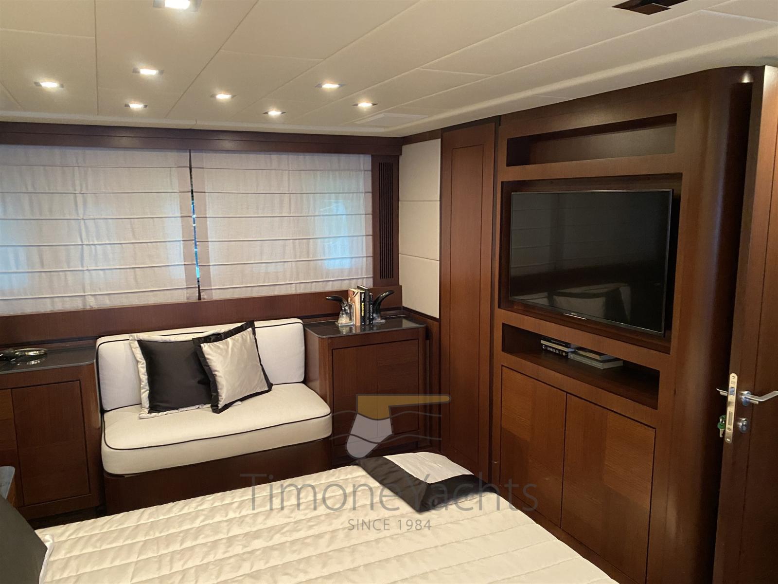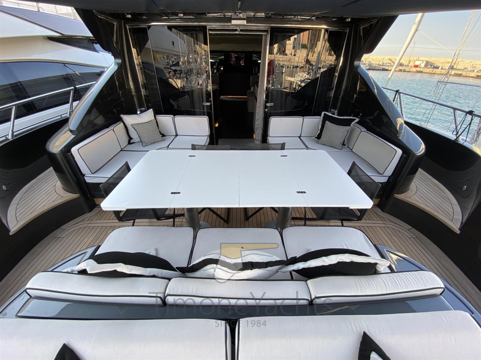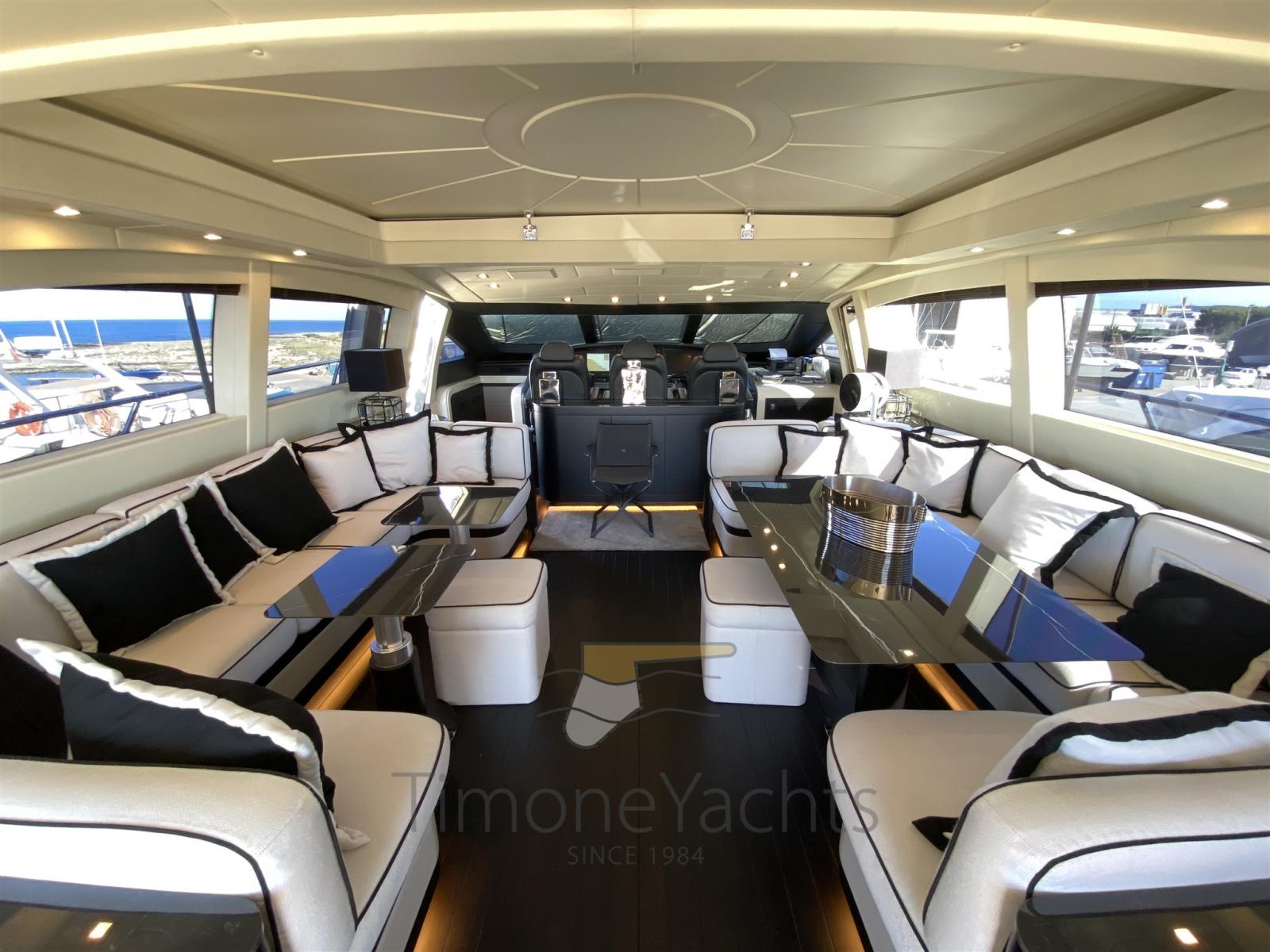 Passavant en teck, Douche de cockpit, Phares fixes arrière, Phare de poursuite, Flaps électriques, Garage à annexe, Hard top, Extincteur(s) fixe(s), Indicateurs de flaps, Lavage de chaine, Éclairage de courtoisie, Spots sous-marins, Passerelle, Porte latérale, Cockpit en teck, Prise de quai, Connexion eau sous pression à quai, table de cockpit, Annexe, Winch électrique arrière, Winch électrique avant.