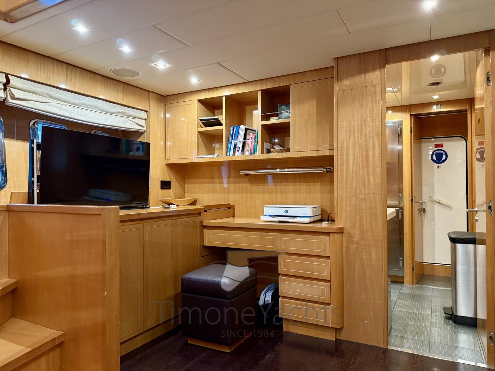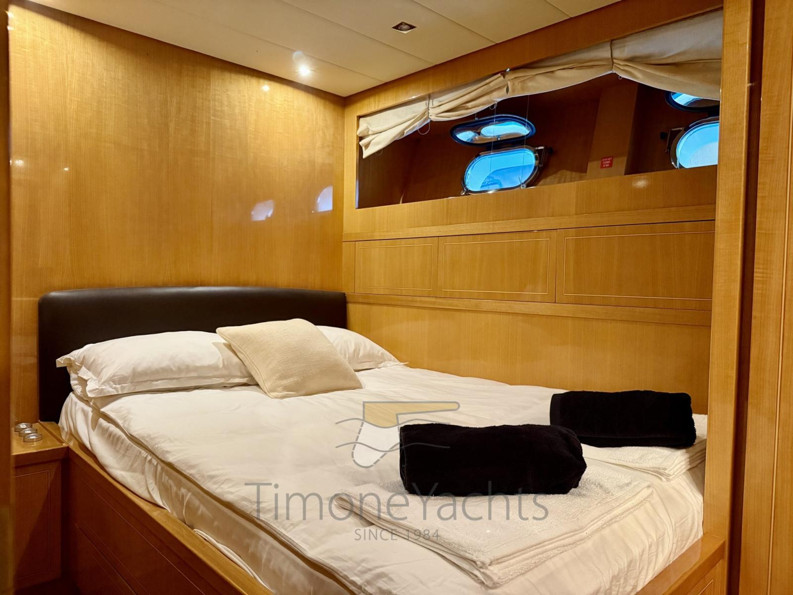 3 grandes cabines invités, cabine principale à l’avant avec lui et la sienne, grand compartiment d’équipage séparé avec cuisine, cabine double avec salle de bains et accès direct à la salle des machines.