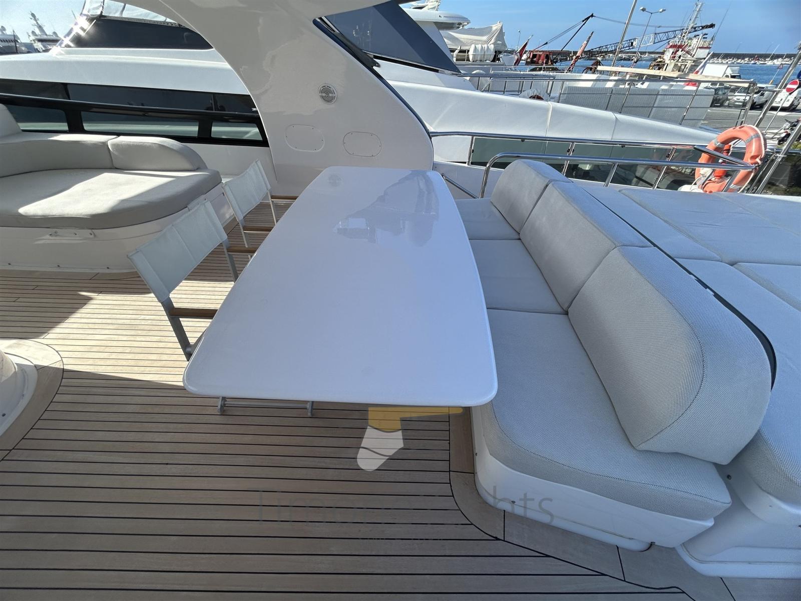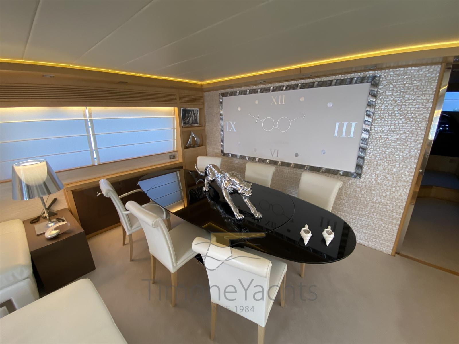 Alarme de pompe de cale, Eau sous pression, Passavant en teck, Douche de cockpit, Propulseur de poupe (Hydraulic), Propulseur d'étrave (Hydraulic), Phare de poursuite, Flaps hydrauliques, Garage à annexe, Bossoirs, Grue de flybridge (nel garage di prua, in the garage up front on main deck), Hard top, Extincteur(s) fixe(s), Indicateurs de flaps, Lavage de chaine, Éclairage de courtoisie, Passerelle, Plateforme arrière, Porte latérale, Cockpit en teck, Prise de quai, Connexion eau sous pression à quai, Onduleur, Guindeau électrique, Echelle de coupée, Echelle de bain, Stabilisateurs, table de cockpit, Annexe, Corne, Winch électrique arrière, Winch électrique avant.