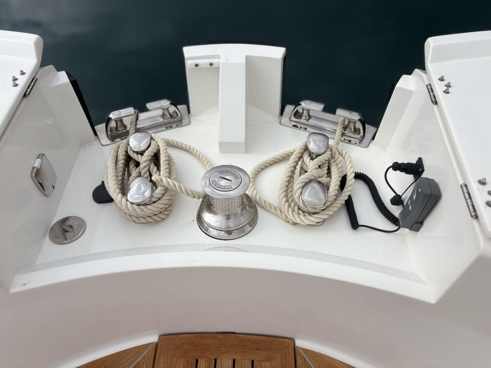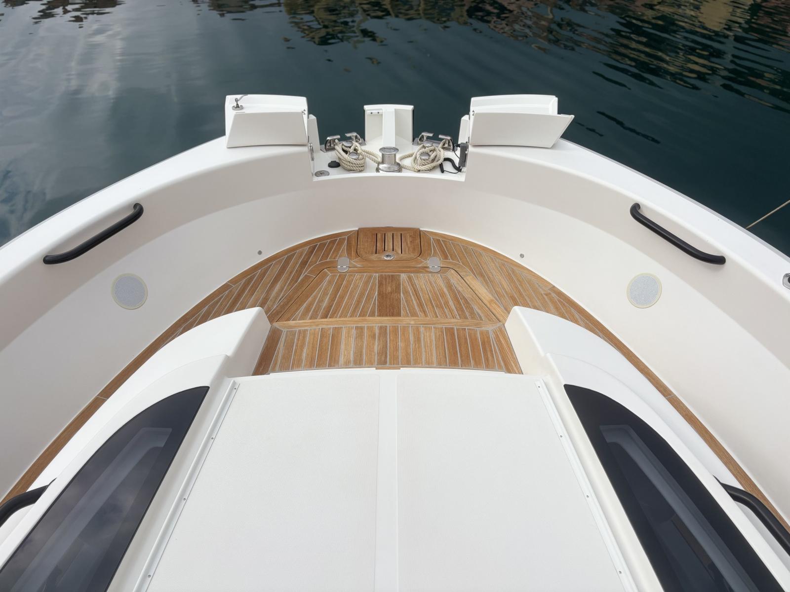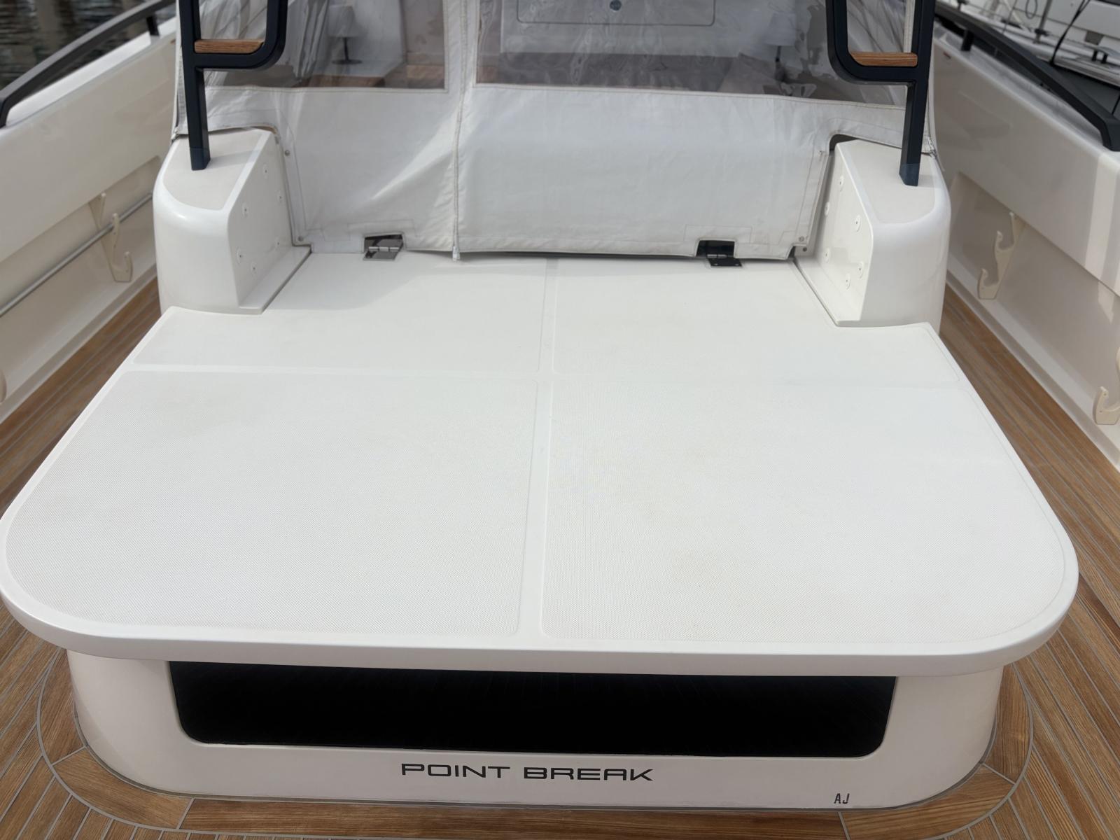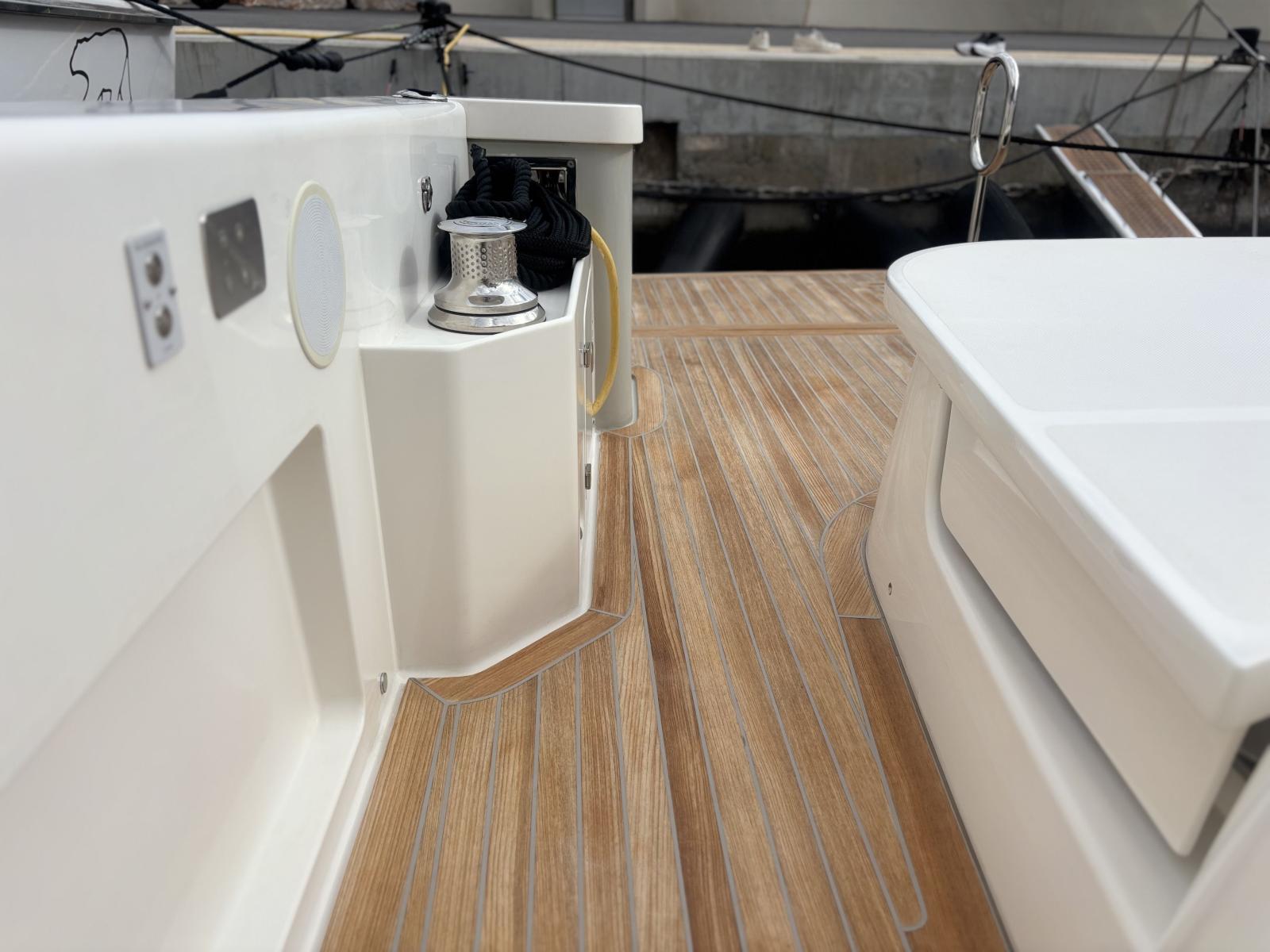 Pont premium orienté autonomie et facilité d’usage : passerelle hydraulique et plateforme hydraulique pilotées via tableaux de commande inox Opacmare (2025), offrant précision, fiabilité et ergonomie. Bâches Crystal de fermeture du carré extérieur (2024) + toiles d’ombrage latérales (2024) pour protection complète. Bimini avec toiles d’ombrage montées sur pôles carbone couvrant les zones avant et arrière