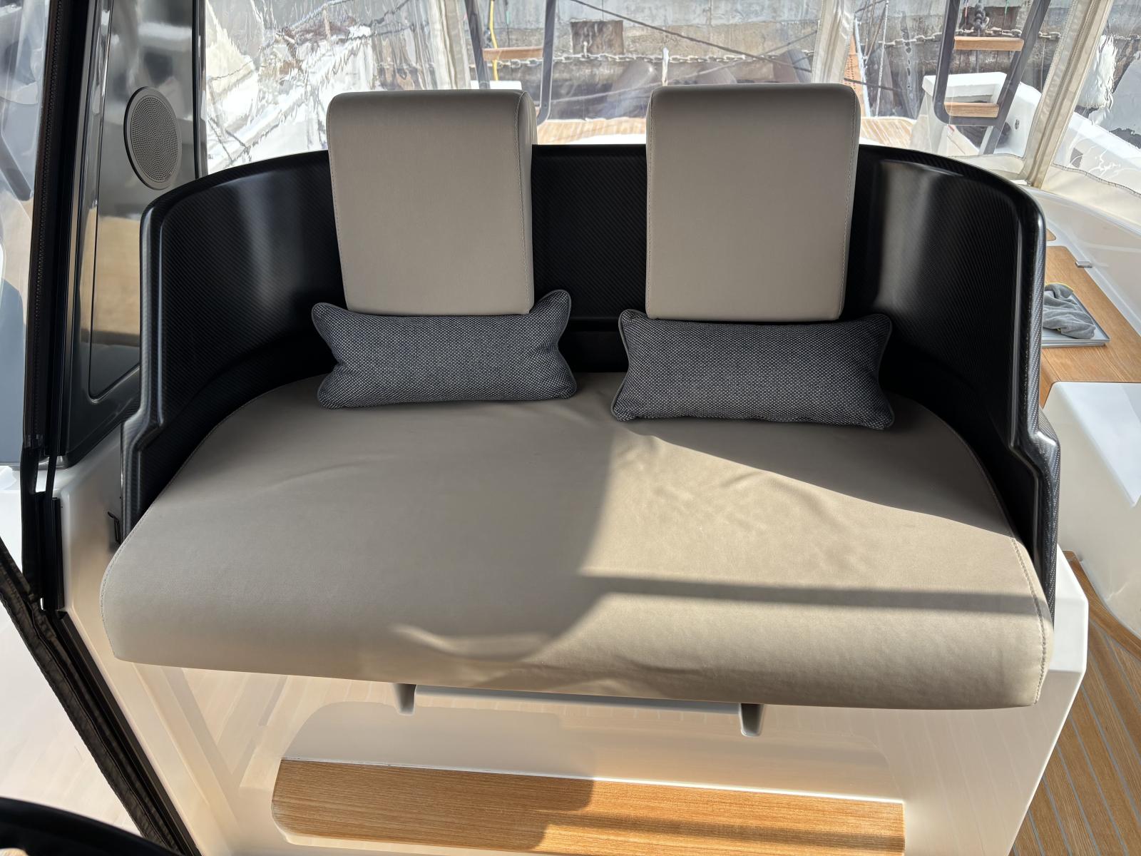 Cockpit et carré extérieur pensés pour vivre dehors : fermeture complète du carré par bâches vitres Crystal avec grandes fenêtres (2024) et toiles d’ombrage latérales (2024) pour un confort maximal au mouillage comme en navigation.