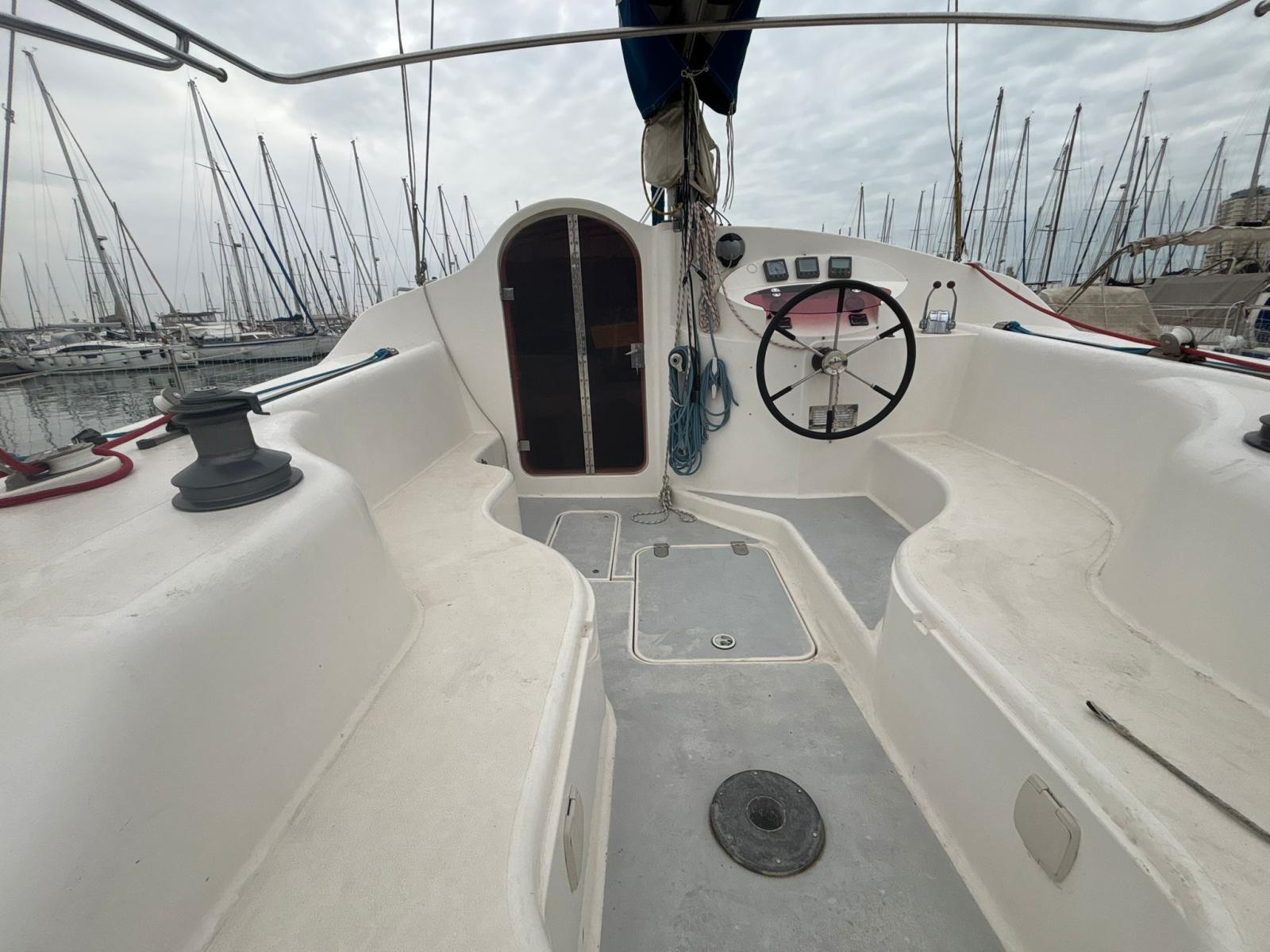 Plan de voilure complet comprenant grand-voile, génois et trinquette sur enrouleur, permettant d’adapter facilement la toile selon les conditions. Catamaran facile à manœuvrer grâce à sa double motorisation et bénéficiant d’une excellente visibilité depuis le cockpit pour les manœuvres de port.