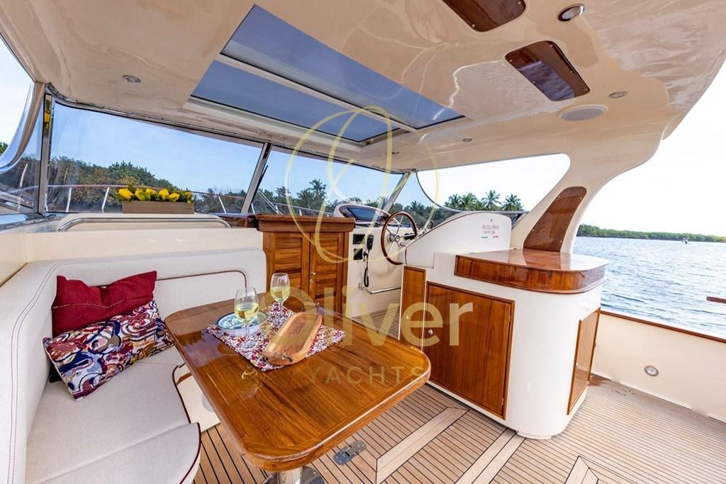 À l’extérieur, le teck sur le pont et le cockpit, la passerelle hydraulique, la généreuse plateforme arrière et le second coin cuisine extérieur avec plaque et évier en céramique se démarquent. Le cockpit est protégé par un toit dur avec un toit ouvrant coulissant, une solution qui permet une ventilation naturelle et une utilisation polyvalente en toutes saisons.