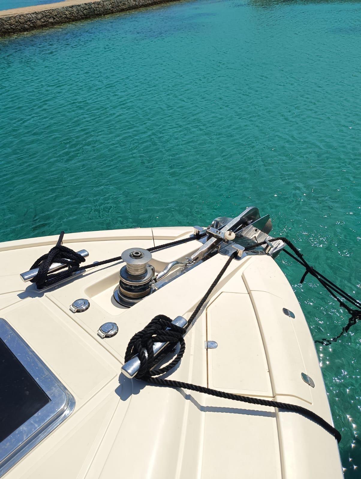 Alarme moteur, Alarme de pompe de cale, Eau sous pression, Batteries (8), Douche de cockpit, Propulseur d'étrave (Vetus), Hélice de rechange, Flaps hydrauliques, Garage à annexe, Extincteur(s) fixe(s), Indicateurs de flaps, Lavage de chaine, Éclairage de courtoisie, Passerelle (Idraulica), Plateforme arrière, Pompe de cale automatique, Pompe de cale manuelle, Cockpit en teck, Prise de quai, Onduleur, Rollbar, Guindeau électrique, Echelle de bain, table de cockpit, Annexe (Novamares 2,80 + FB Suzuki 6 hp), Winch électrique arrière.