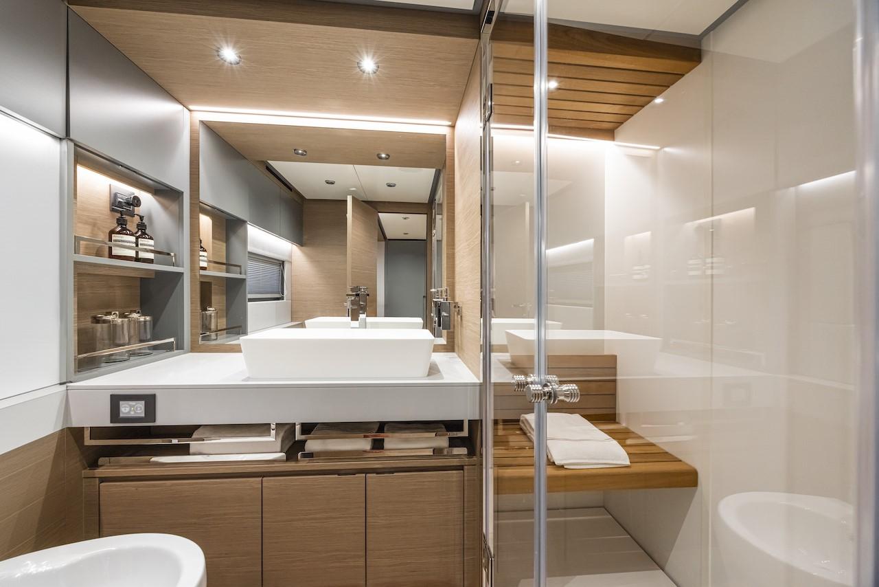 La cabine principale dispose d'une salle de bain attenante aux finitions raffinées, confirmant l'attention portée par Cantiere del Pardo au design intérieur.