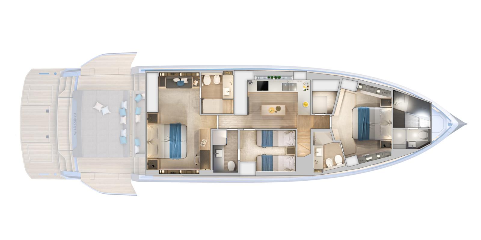 Dans la version Beach du Pardo GT75, toute la partie arrière peut être transformée en une terrasse étendue donnant sur la mer. Ceci est rendu possible par des ailes latérales à commande hydraulique qui permettent de façonner toute la zone selon les souhaits du propriétaire. Depuis cet espace extérieur ouvert, il est possible d'accéder directement à la cabine principale grâce à des vitres coulissantes électriques. Il s'agit d'une suite dédiée au propriétaire, meublée et conçue avec une extrême attention aux détails, avec des vues privilégiées vers des panoramas inestimables et des réveils à couper le souffle.