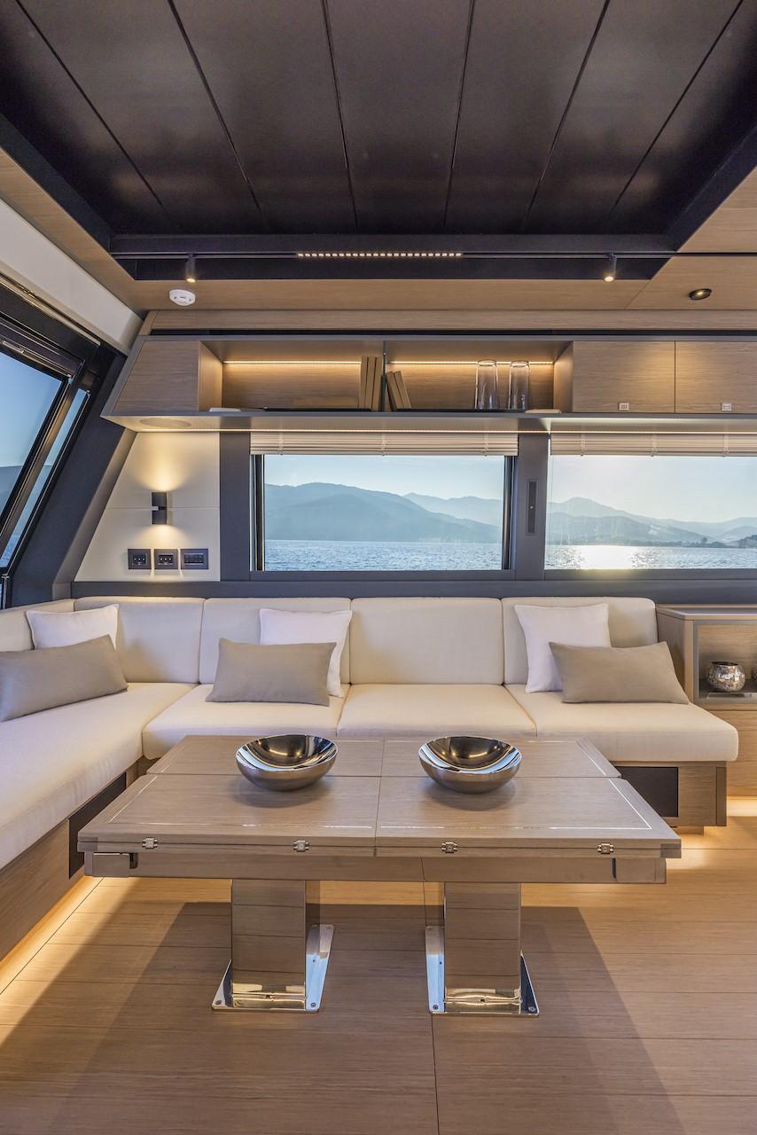 La conception de l'intérieur, ainsi que de l'extérieur, a été confiée une fois de plus à Nauta Design, maître dans l'art de savoir entrelacer le raffinement de l'ameublement et l'efficacité de la distribution de l'espace. Toujours pour le GT75, l'élégant aménagement intérieur est disponible en version cuisine haute ou cuisine basse, permettant au propriétaire de vivre le bateau de manière plus conviviale ou plus privée.